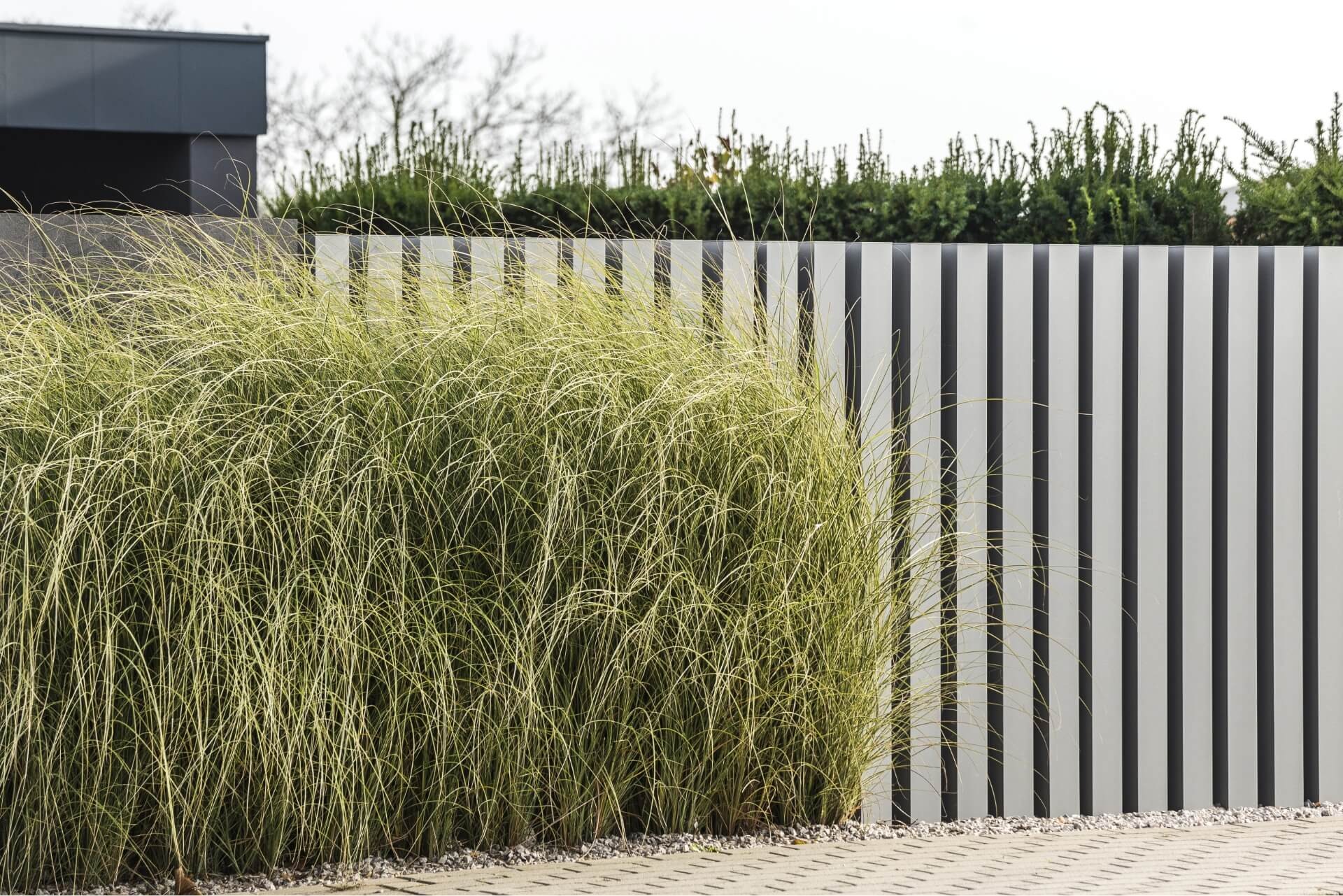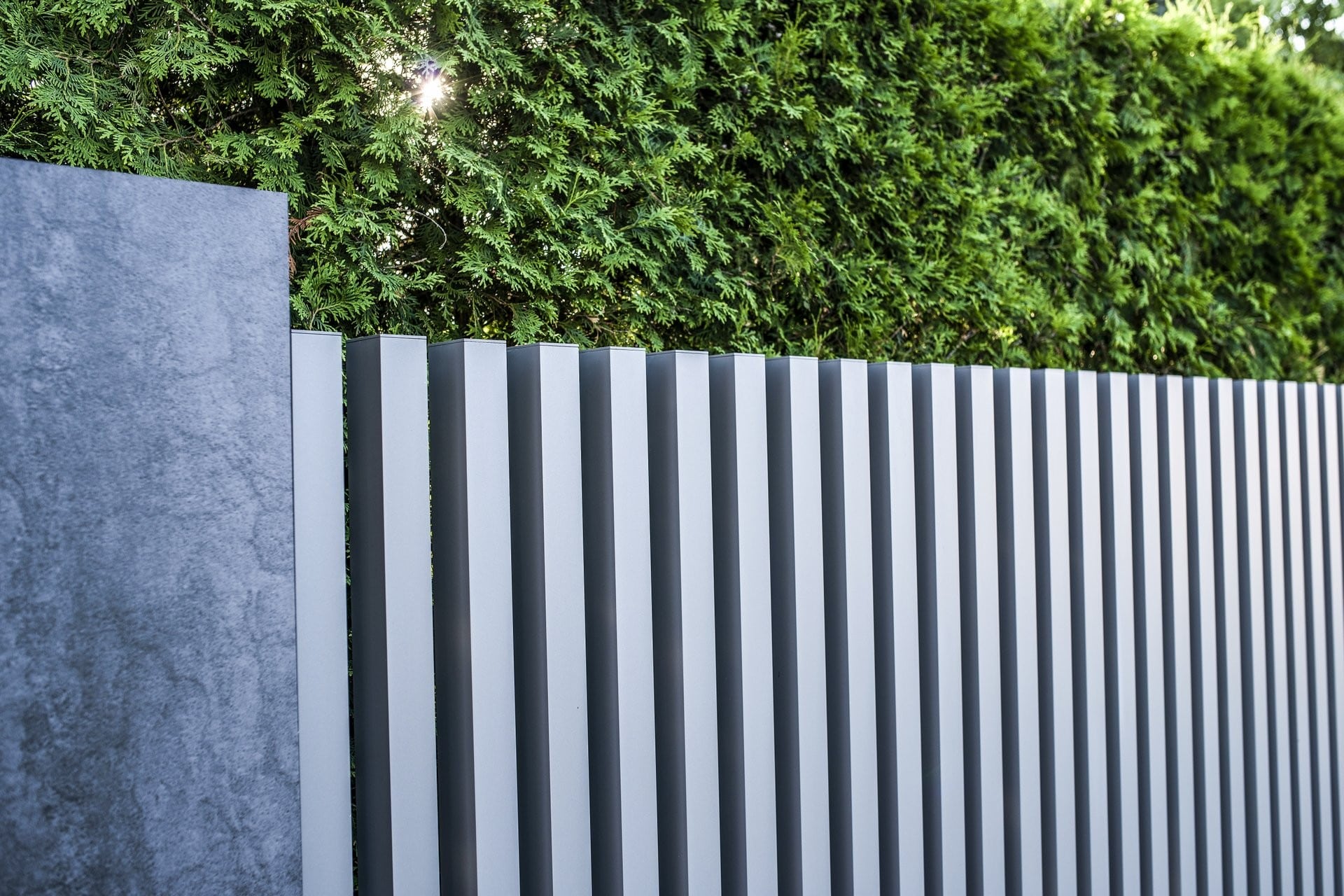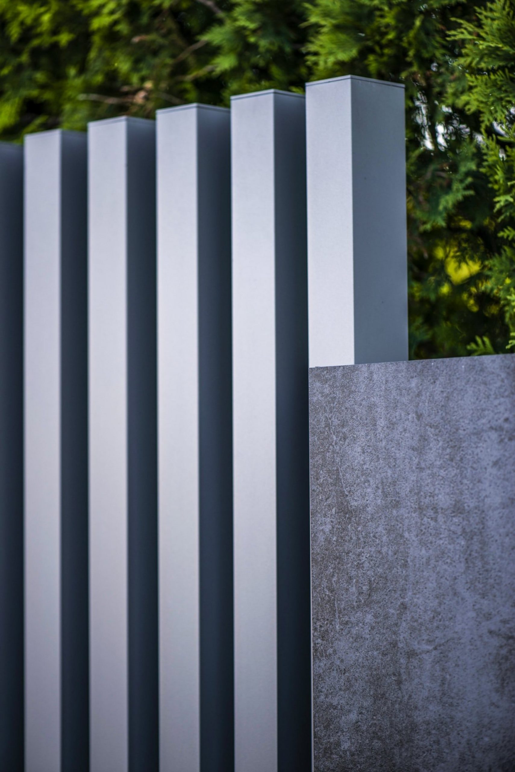Langlebige Aluminiumpfosten können in jeder Farbe aus der RAL-Palette pulverbeschichtet oder mit Beschichtungen versehen werden, die Holz täuschend echt imitieren. Profile mit einem Querschnitt von 40×80 mm, 60×80 mm, 60×120 mm und massiven 100×200 mm Profilen sind erhältlich. Die Größe der Dehnungsfugen zwischen den Profilen kann im Bereich von 20 bis 120 mm angepasst werden. Eine Änderung der Dehnungsfuge und des Profilquerschnitts beeinflusst sowohl die Materialmenge und den Preis des Zauns als auch den Transparenzgrad. Je dichter die Profile, desto höher ist das Maß an Privatsphäre.