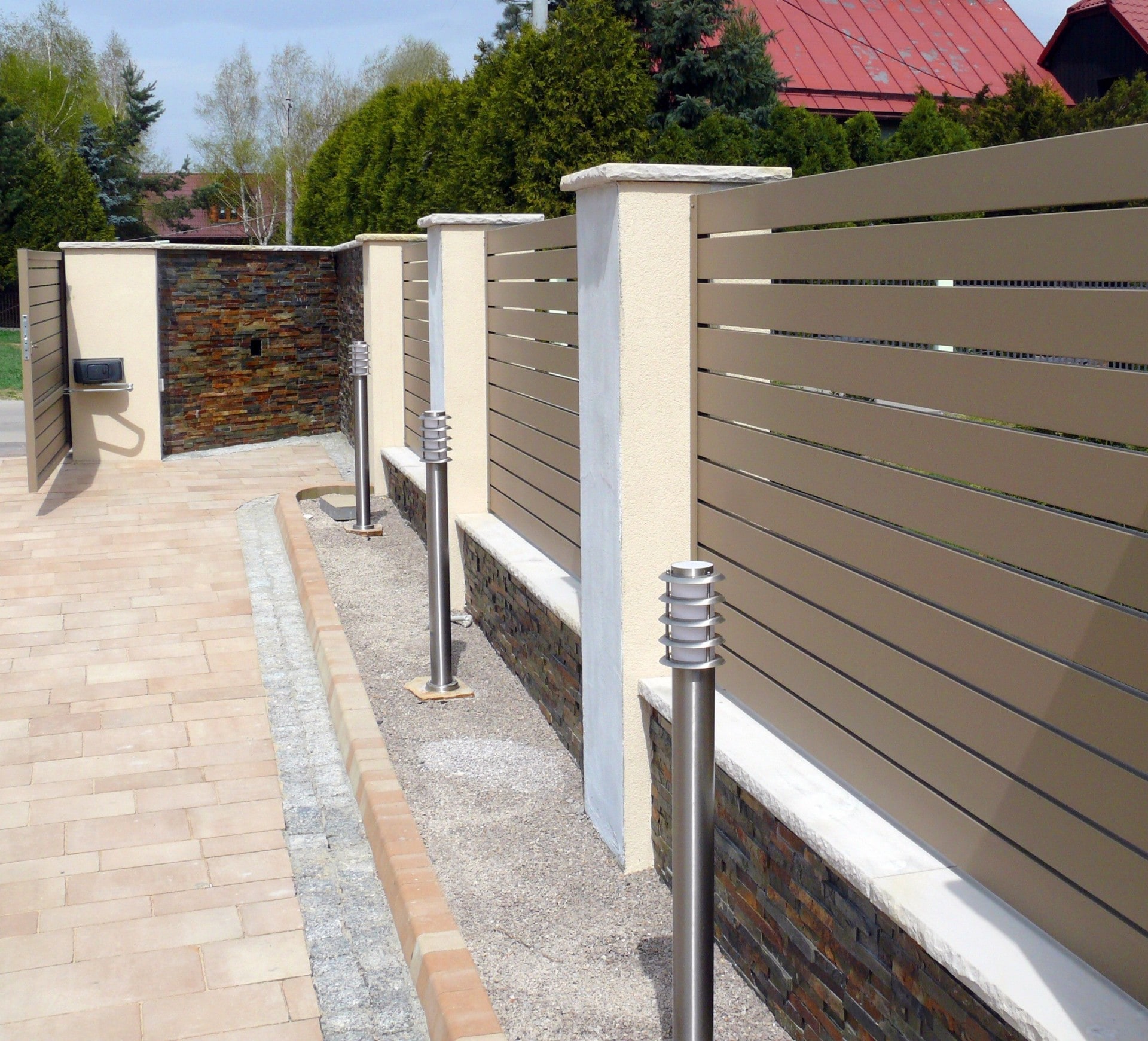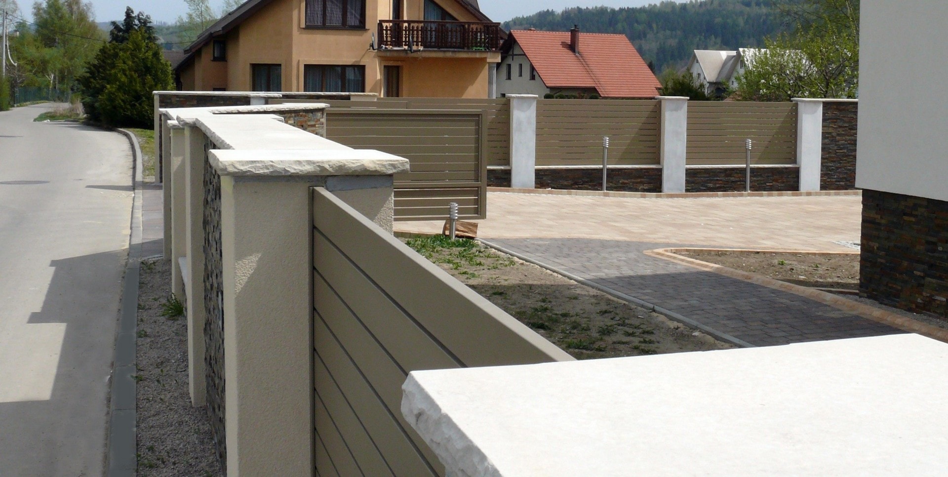 Der Kunde kam zu uns auf der Suche nach langlebigen Zaunpaneelen, die zu einem ungewöhnlichen Zaun passen. Die Wände waren mit Naturstein verkleidet, und die Pfosten waren verputzt und mit Sandsteindächern bedeckt.