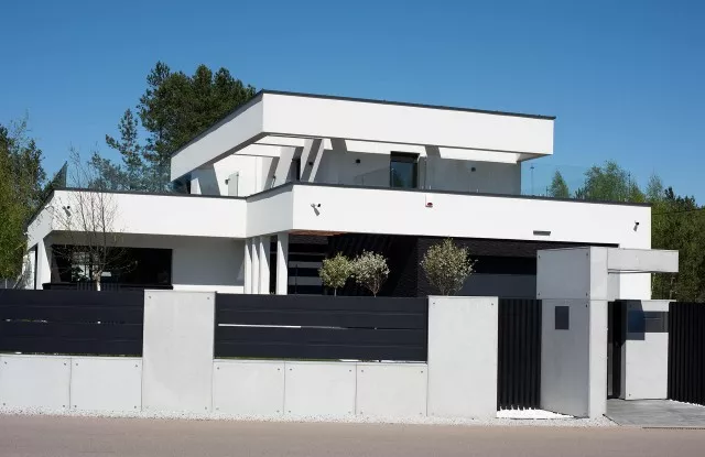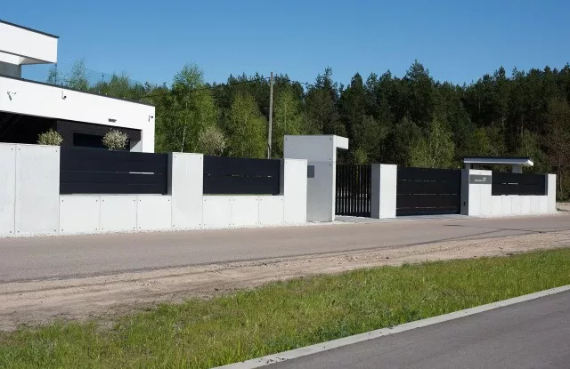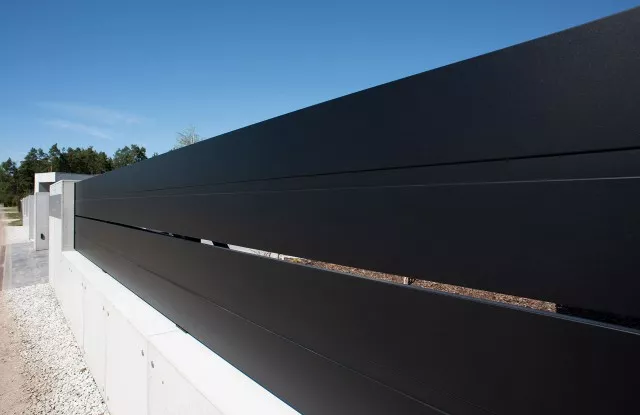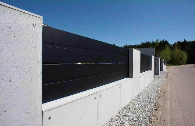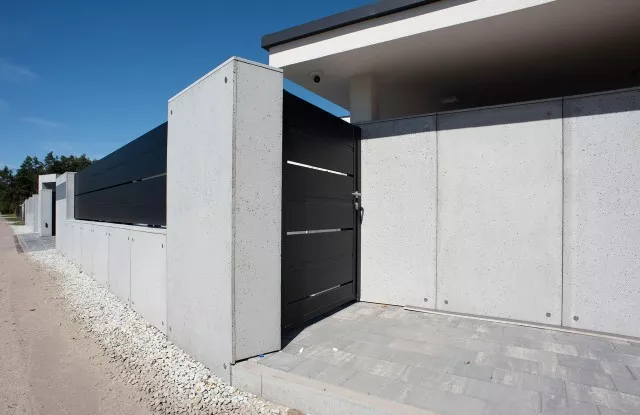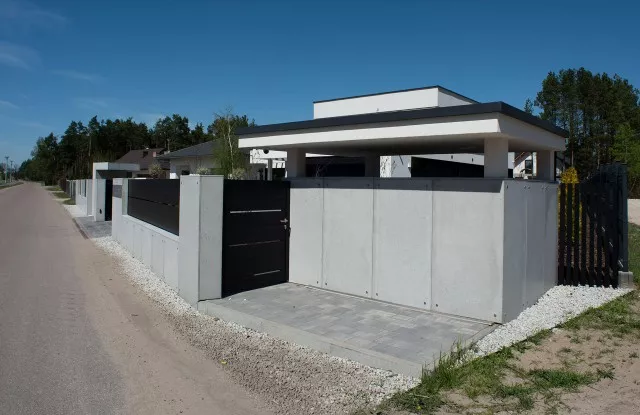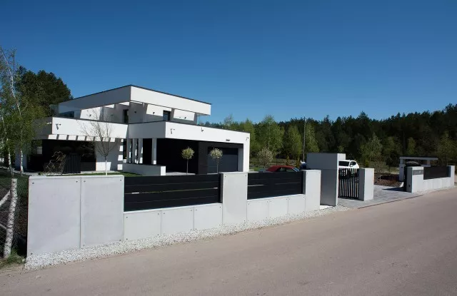 Wir präsentieren einen weiteren Zaun, der als Ergänzung zu einem modernen Haus entworfen wurde. In diesem beeindruckenden Projekt haben wir zwei Systeme aus langlebigen Aluminium-Zaunelementen verwendet. An den mit Architekturbetonplatten verkleideten Wänden sind breite Arete Space-Aluminium-Zaunelemente in Schwarz montiert. Dies ist eine Lösung, die häufig von Menschen gewählt wird, die Wert auf Privatsphäre im Garten legen. In kurzen Abschnitten, in der Nähe des Tors und des Müllschuppens, befinden sich vertikale Arete Vertico-Aluminium-Zaunelemente, die dem Zaun optisch Leichtigkeit verleihen.