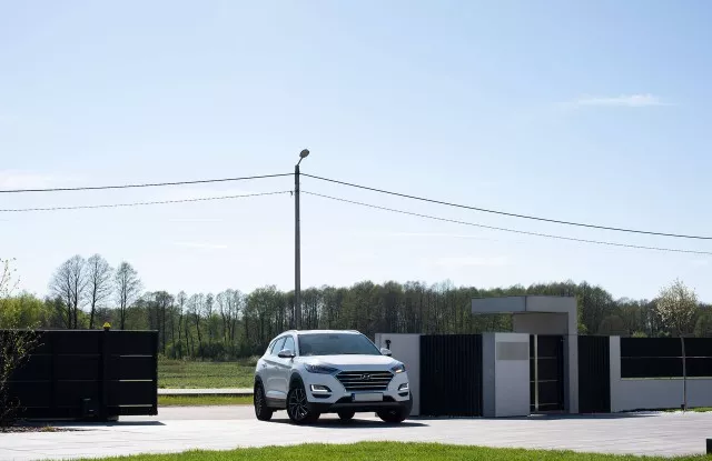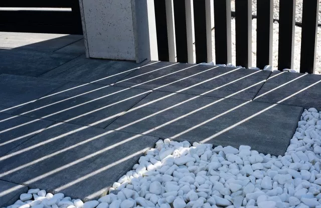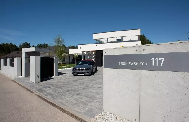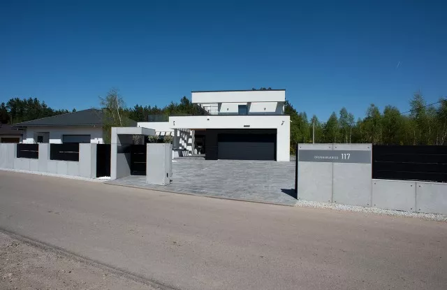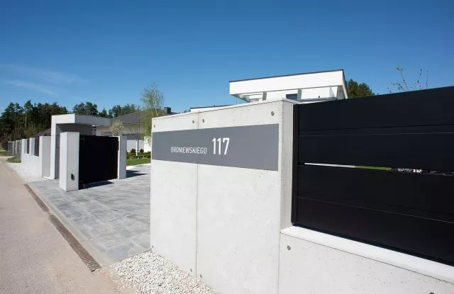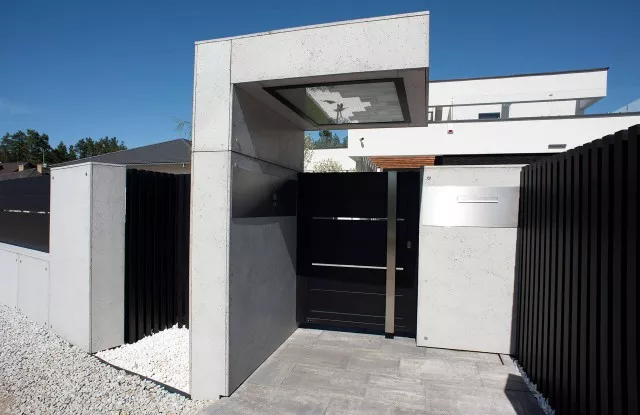 Die moderne Pforte Arete Space ist mit einem kleinen Dach mit LED-Beleuchtung bedeckt. In der Nähe des Eingangs befindet sich ein Durchreichebriefkasten und im mittleren Teil des Zauns befindet sich eine eindrucksvolle, aus Edelstahlblech ausgeschnittene Hausnummer. Der Zugang zum Grundstück erfolgt durch ein modernes Schiebetor mit Signalbeleuchtung. Eine zusätzliche Pforte auf der Straßenseite führt zu einem überdachten Müllschuppen, der in seiner Form auf die Form des Gebäudes verweist.