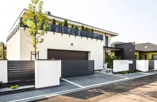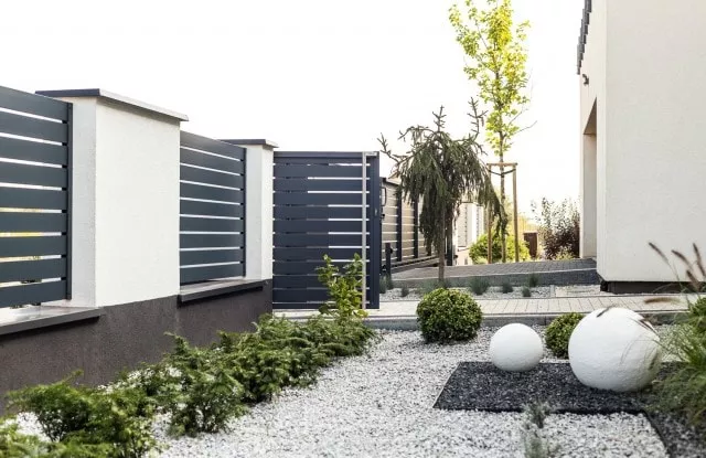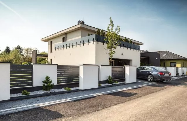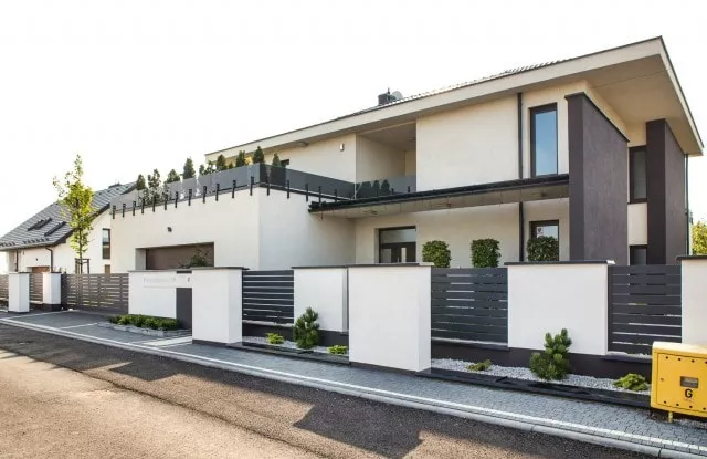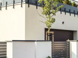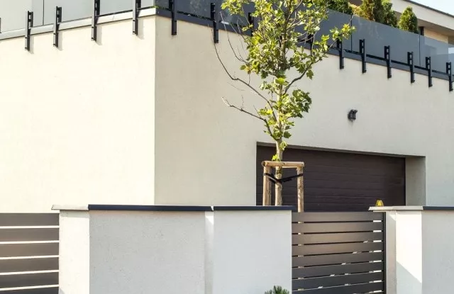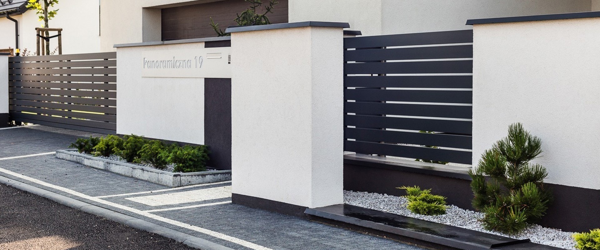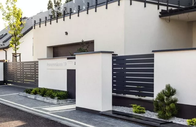 Duality ist ein weiteres ungewöhnliches Projekt, das die großartigen Möglichkeiten des Arete Horizon-Systems zeigt. Der Kunde kam zu uns auf der Suche nach einem langlebigen und modernen Aluminiumzaun, der sich auf den charakteristischen Gebäudekörper bezieht. Er zeigte uns einige Bilder, die uns inspirierten und als Ausgangspunkt für die weitere Arbeit dienten. Das Endergebnis ist ein schwarz-weißer Zaun, der auf einfachen verputzten Arete Horizon-Wänden und Aluminium-Zaunpaneelen basiert. Ein charakteristisches Element des Projekts ist eine zusätzliche Reihe verputzter Pfosten, die den Raum für attraktive Grünflächen abgrenzt.