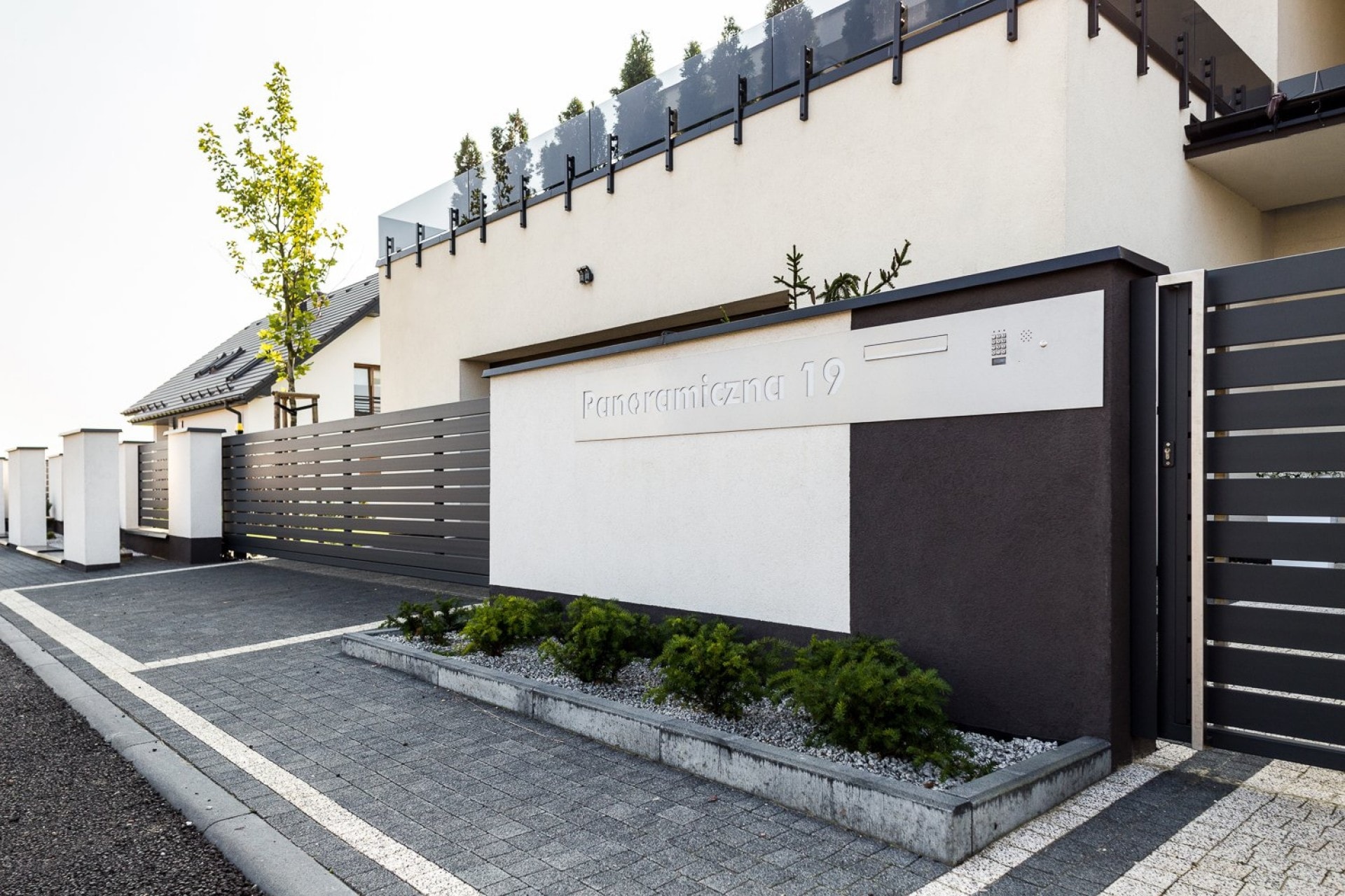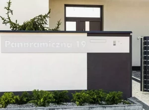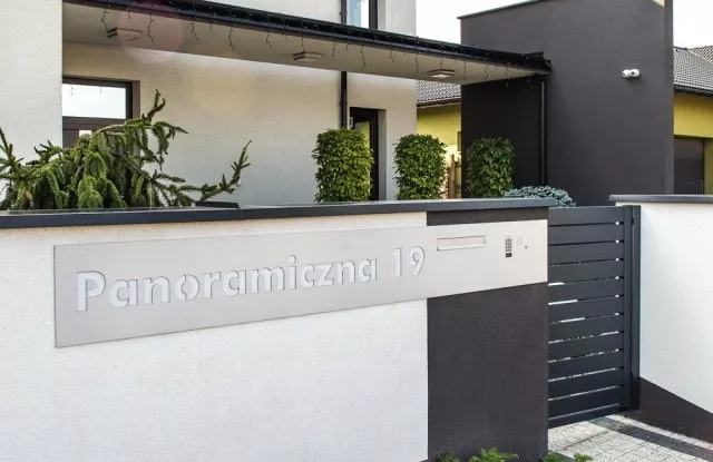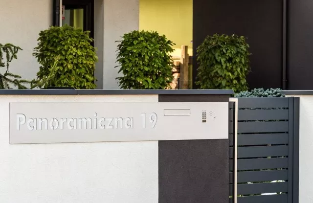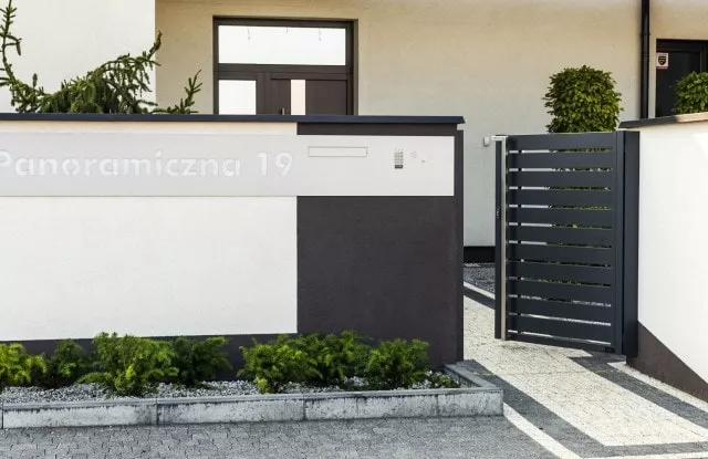 Moderne Zäune zeichnen sich durch Ästhetik und Funktionalität aus, daher sind entsprechende Zusatzelemente notwendig. Der Kunde entschied sich für einen modernen Briefkasten – Modern Post Box mit eingebauter Videosprechanlage und Ziffernblock. Das Längspaneel wurde auf Bestellung gefertigt und mit einer lasergeschnittenen Gebäudeadresse versehen, die nach Einbruch der Dunkelheit leuchtet. Verputzte Wände und Fundamente wurden mit Aluminiumdächern gesichert, die den Zaun vor den schädlichen Auswirkungen von Wasser schützen. Das moderne Schiebetor verfügt über Signalleuchten, was die Sicherheit beim Verlassen des Grundstücks erhöht.