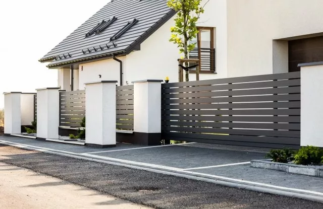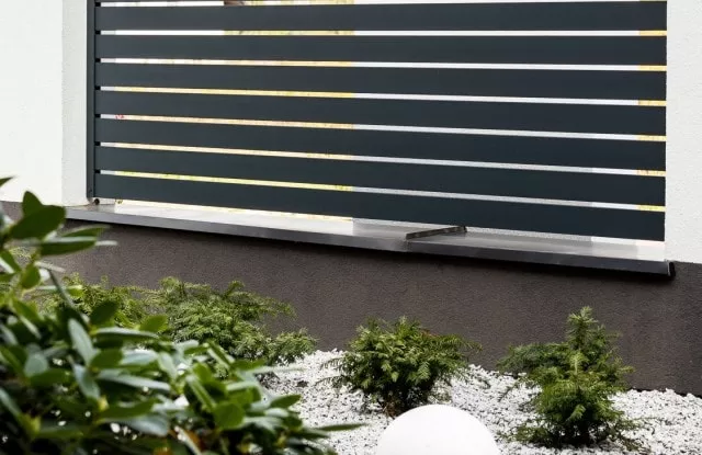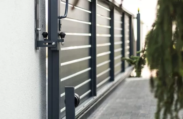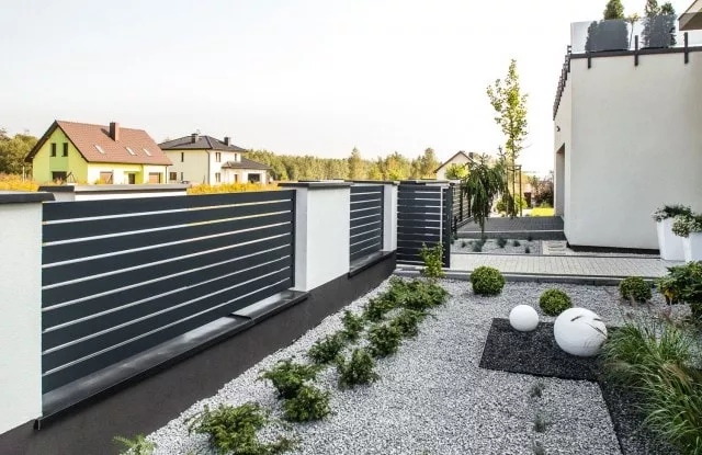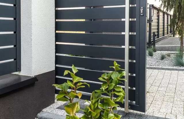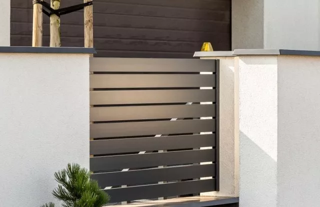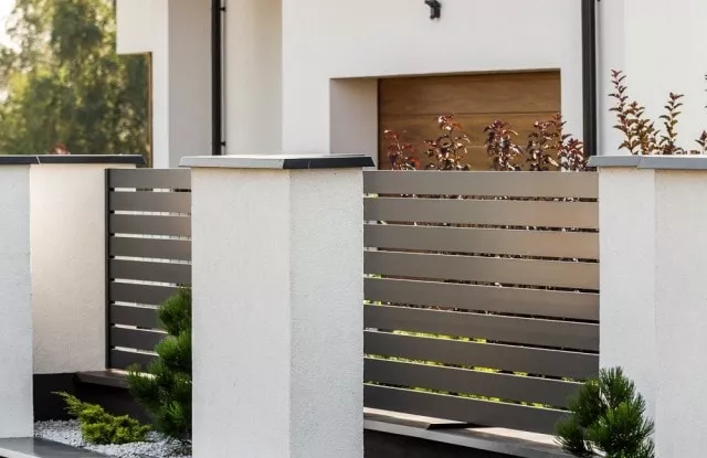 Die Aluminium-Zaunelemente Arete Horizon garantieren den Bewohnern Privatsphäre auf dem Grundstück. Die Farbe wurde auf die Fassade des Gebäudes abgestimmt.
