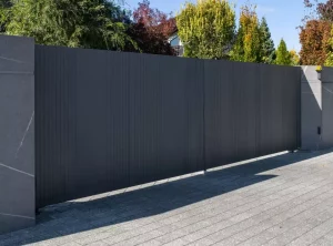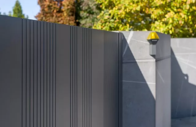 Das Tor und das moderne Doppelflügeltor wurden auf Basis des Pure Individual-Systems hergestellt. Ihre Rahmen sind mit glattem Aluminiumblech mit gefrästen Details gefüllt und in Anthrazit lackiert. Das Design der vertikalen Linien verleiht den Elementen einen einzigartigen Charakter und ist eine optische Referenz zu den Arete Vertico-Profilen. Die Frästechnik bietet enorme Möglichkeiten, da sie die Herstellung einzigartiger Zäune mit beliebigen Mustern und Aufschriften ermöglicht.