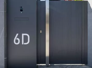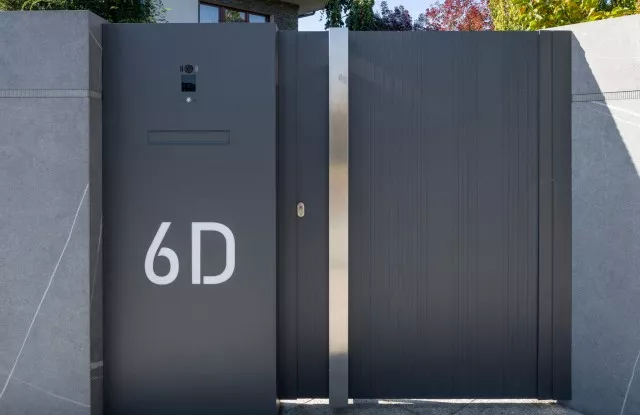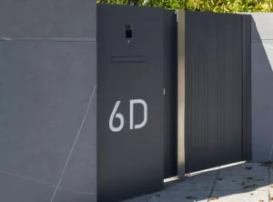 Auf der linken Seite des Eingangs befindet sich eine multifunktionale Rockina Cubero Säule, die wie das Tor mit glattem anthrazitfarbenem Blech verkleidet ist. Die Säule verfügt über einen Durchreichebriefkasten, eine moderne Videosprechanlage und eine beleuchtete Hausnummer.