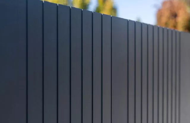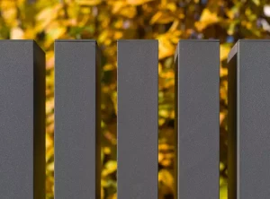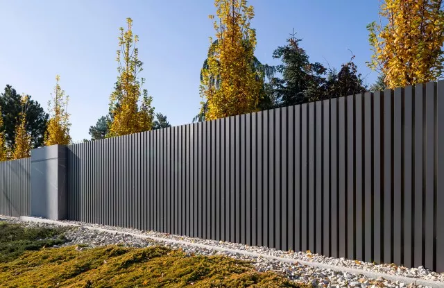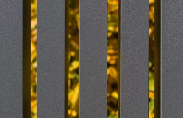 Der Zaun besteht aus vertikalen anthrazitfarbenen Aluminiumprofilen, die direkt in den Untergrund eingelassen wurden. Der Abstand zwischen den einzelnen Profilen wurde so gewählt, dass der Zaun leicht wirkt und den Bewohnern Privatsphäre bietet. Vertico-Profil 60x120 mm, Dehnungsfuge 40 mm.