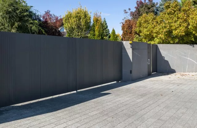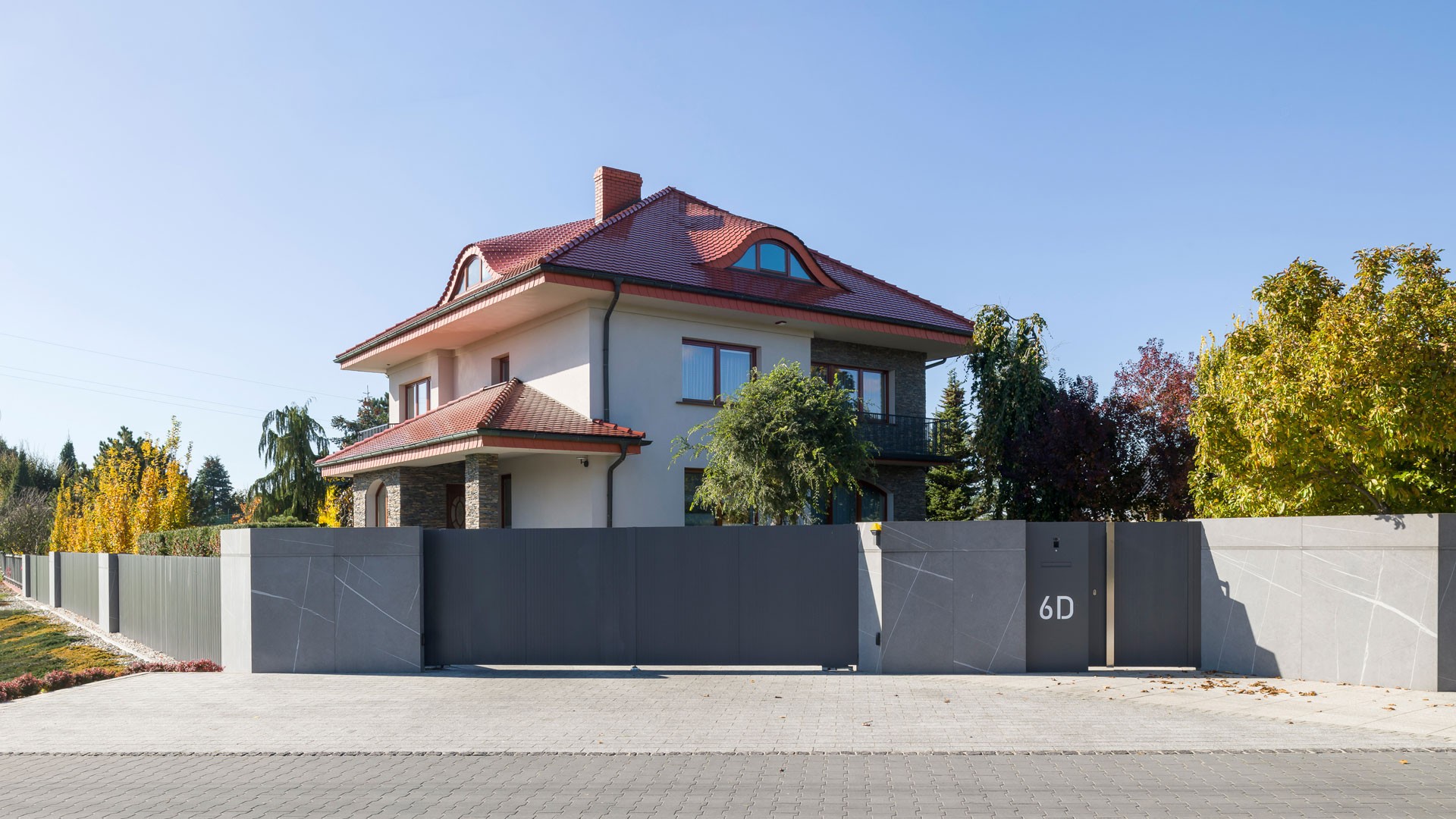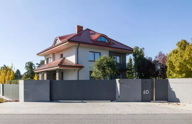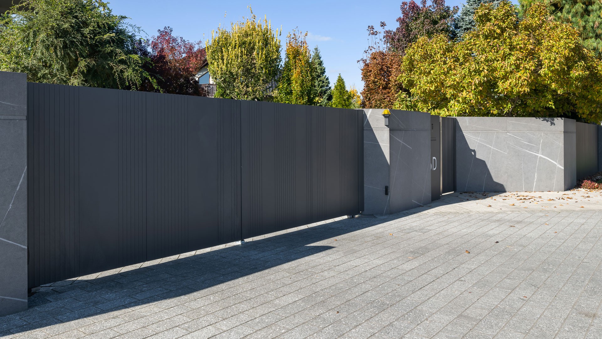 Der Torrahmen ist mit anthrazitfarbenem Glattblech aus Aluminium mit dekorativer Fräsung ausgefüllt. Das Design wurde auf individuelle Bestellung erstellt. Die schnelle Unterflurautomatik nimmt wenig Platz ein und beeinträchtigt die Optik des Zaunes nur minimal. Die Form der Einfahrt machte den Einsatz spezieller Scharniere erforderlich, die ein Öffnen der Flügel in einem ungewöhnlichen Winkel ermöglichen.