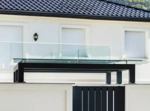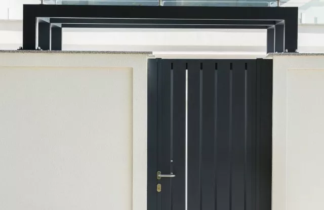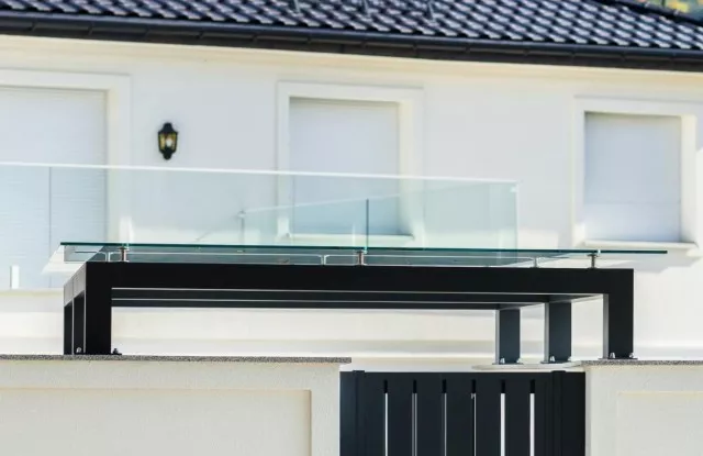 Das minimalistische Dach besteht aus sicherem, wetterbeständigem Glas. Die Glasscheibe auf einer Aluminiumkonstruktion in einer Farbe, die zum Rest des Zauns passt, definiert die ästhetische Zone mit Mülleimern. Der Zugang erfolgt vom Garten oder über ein zusätzliches Tor an der Vorderseite des Zauns.
