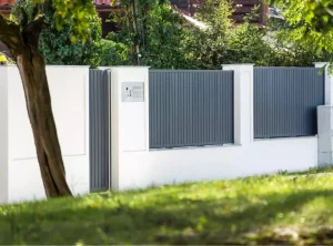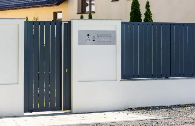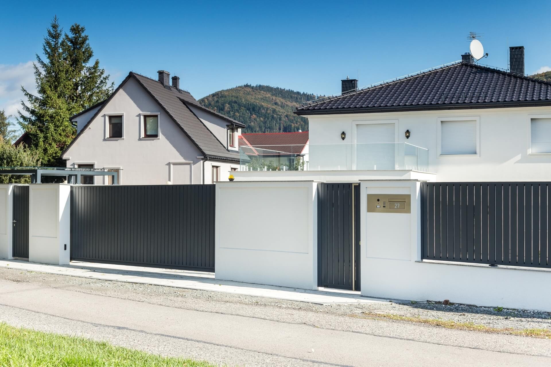 Die Basis des Zauns bilden klassische weiß verputzte Wände mit charakteristischen rechteckigen Vertiefungen. Sie sind mit vertikalen Aluminium-Zaunelementen Arete Linearo Graphit gefüllt, die eine langlebige und wartungsfreie Alternative zu Holzlatten darstellen. Die Pfosten und Fundamente wurden zusätzlich mit klassischen Steindächern bedeckt, die eine dekorative Funktion erfüllen und den Zaun vor Wasser schützen.