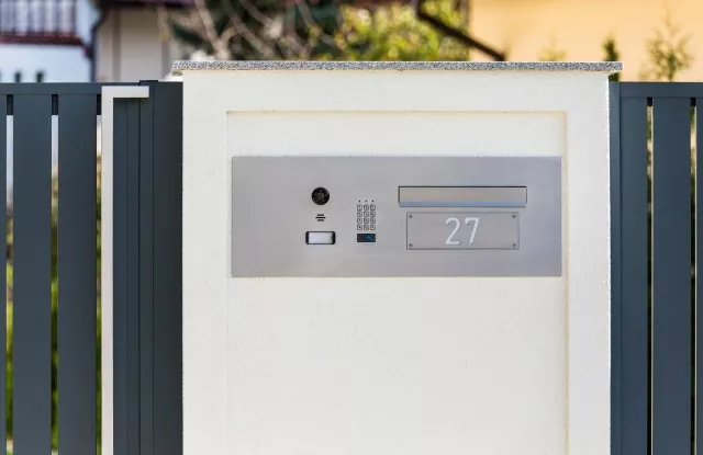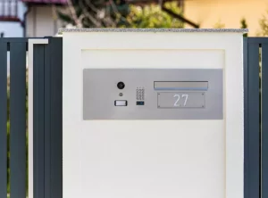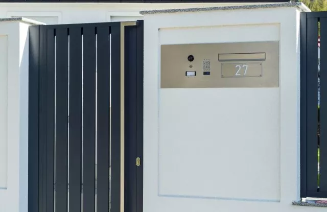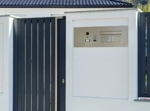 Die Edelstahlblende des Durchwurfbriefkastens wurde maßgefertigt. Der Kunde entschied sich für eine Ausstattung mit Ziffernblock, Videosprechanlage und beleuchteter Hausnummer.