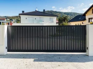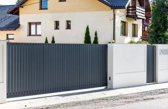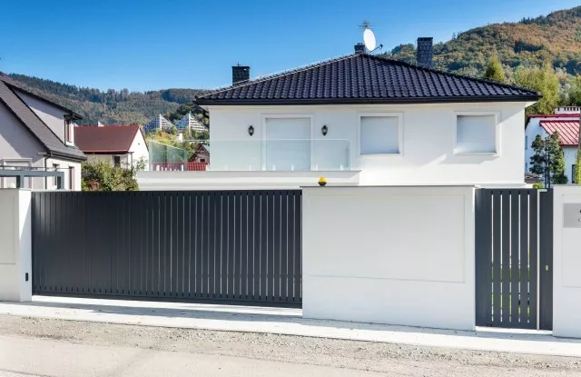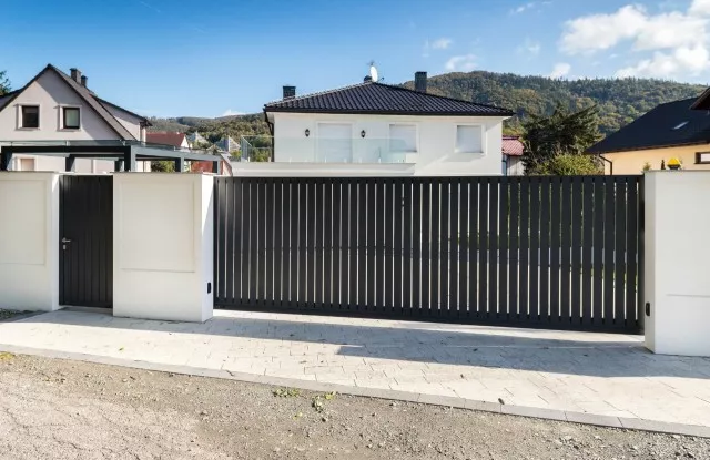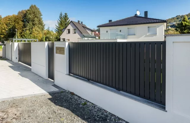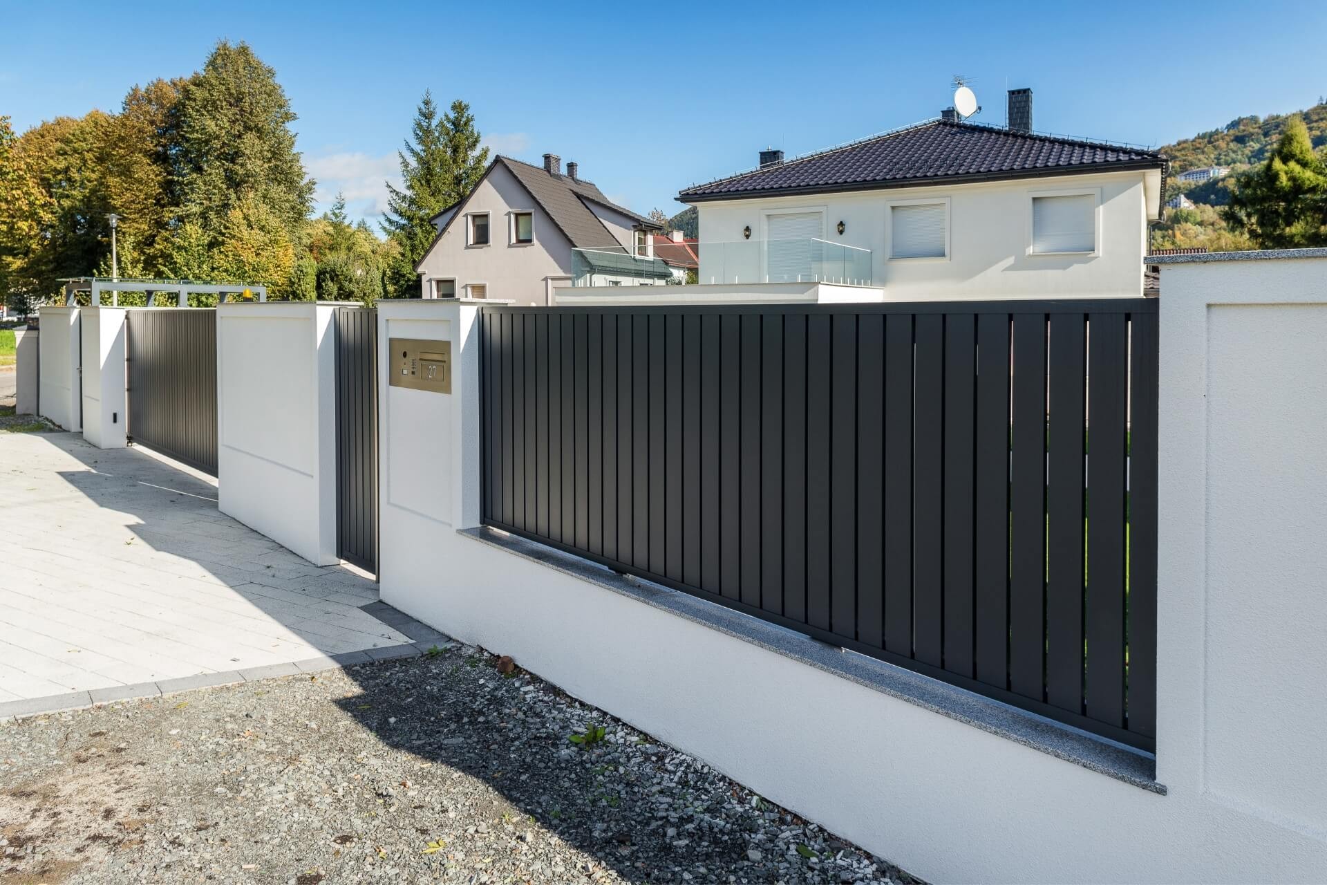 Ein modernes Schiebetor mit Arete Linearo-Zaunelementen unterstreicht das minimalistische Design des Zauns. Aufgrund der Nähe zu einer stark befahrenen Straße wurde neben Ampeln eine robuste Premium-Automatik eingesetzt, die das Tor nur halb so schnell öffnet wie herkömmliche Mechanismen.