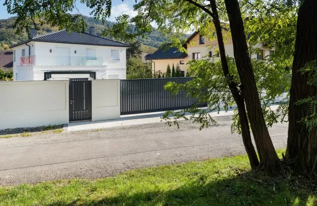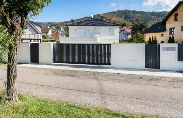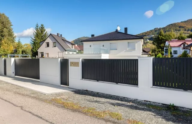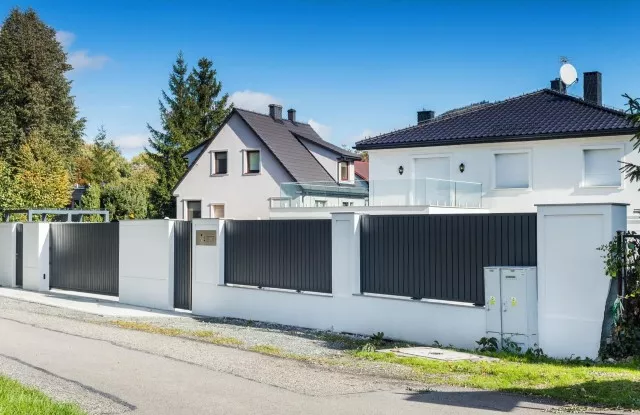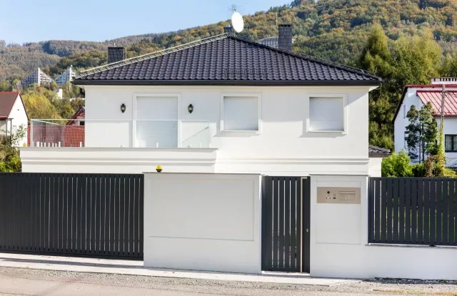Der Kunde war auf der Suche nach einem klassischen Zaun mit einem Hauch von Modernität, der zur ungewöhnlichen Form des Gebäudes passt. Der Designer hat einen minimalistischen Zaun in Kontrastfarben vorgeschlagen, der auf verputzten Wänden und unserem neuen System namens Arete Linearo basiert. Aluminium-Zaunelemente mit traditioneller vertikaler Anordnung sehen in Verbindung mit modernen Accessoires und einem auffälligen Glasdach großartig aus.