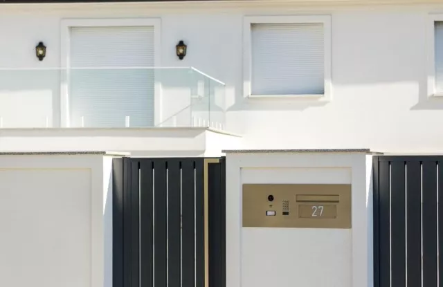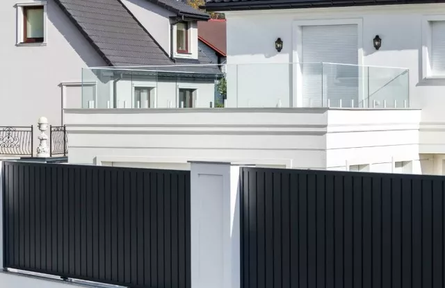Die Designer von Xcel vergessen nie die Funktionalität. Das moderne Schiebetor wurde mit einer langlebigen Automatisierung ausgestattet und in der Nähe wurde eine Signalbeleuchtung angebracht. Am Eingang befindet sich ein Paneel eines Durchreichebriefkastens mit eingebauter Videosprechanlage, Ziffernblock und beleuchteter Hausnummer. Ein zusätzliches Tor im vorderen Teil des Zauns führt zu einem mit Glasdach überdachten Bereich, in dem Mülleimer aufgestellt sind.