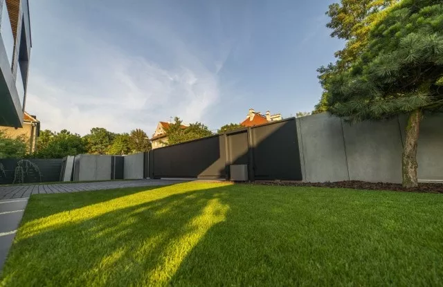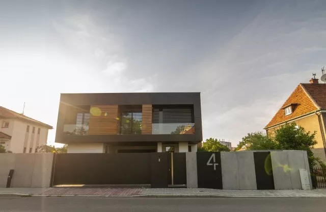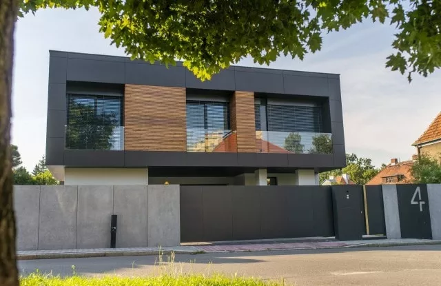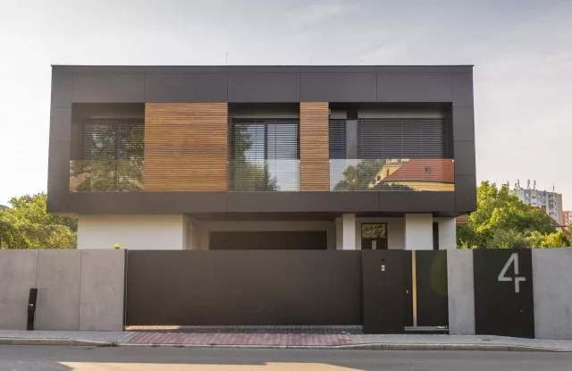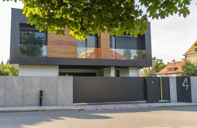 Die Zusammenarbeit begann mit einem Besuch des Grundstücks und einer Besprechung der Kundenbedürfnisse. Nach der Durchführung genauer Messungen begannen wir mit dem Entwurf. Im vorderen Teil konzentrierten wir uns auf einen Vollzaun, der das Grundstück von der belebten Straße abschirmte und den Lärm teilweise dämpfte. Wir verwendeten die Aluminiumkonstruktion Rockin Cubero, die mit großformatigen Platten aus Architekturbeton verkleidet war. Das moderne Schiebetor und die Pforte wurden mit schwarzem Blech verkleidet, dessen Proportionen sich auf die Größe von Betonplatten beziehen. Die Seitenteile des Zauns wurden auf der Basis von Horizon Massive-Zaunpaneelen errichtet, die auf Aluminiumpfosten basieren. Die Privatsphäre der Bewohner ist von allen Seiten geschützt.