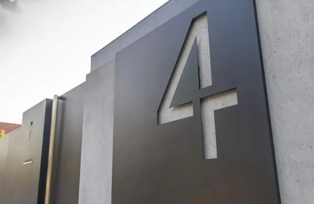Die lasergeschnittene Hausnummer wird nach Einbruch der Dunkelheit automatisch beleuchtet. Aus dem gleichen Metall wurde eine dezente Tür angebracht, hinter der der Gaszähler versteckt ist.