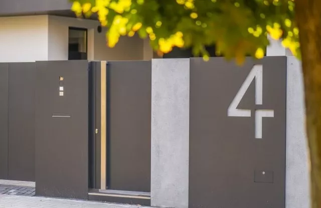 Das schwarze Tor Arete Pure ist mit einem minimalistischen Edelstahlhandlauf ausgestattet und die Seitenscharniere sind verdeckt, um die volle Privatsphäre im Garten zu gewährleisten. In der Nähe des Eingangs befinden sich an einem breiten, mit Blech bedeckten Pfosten eine moderne Video-Gegensprechanlage, ein Durchreichebriefkasten und ein Ziffernblock, der den Zugang zum Grundstück ohne Schlüssel ermöglicht. Auf der anderen Seite des Tors ist eine große, in das Blech ausgeschnittene Hausnummer angebracht.