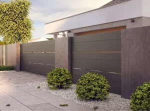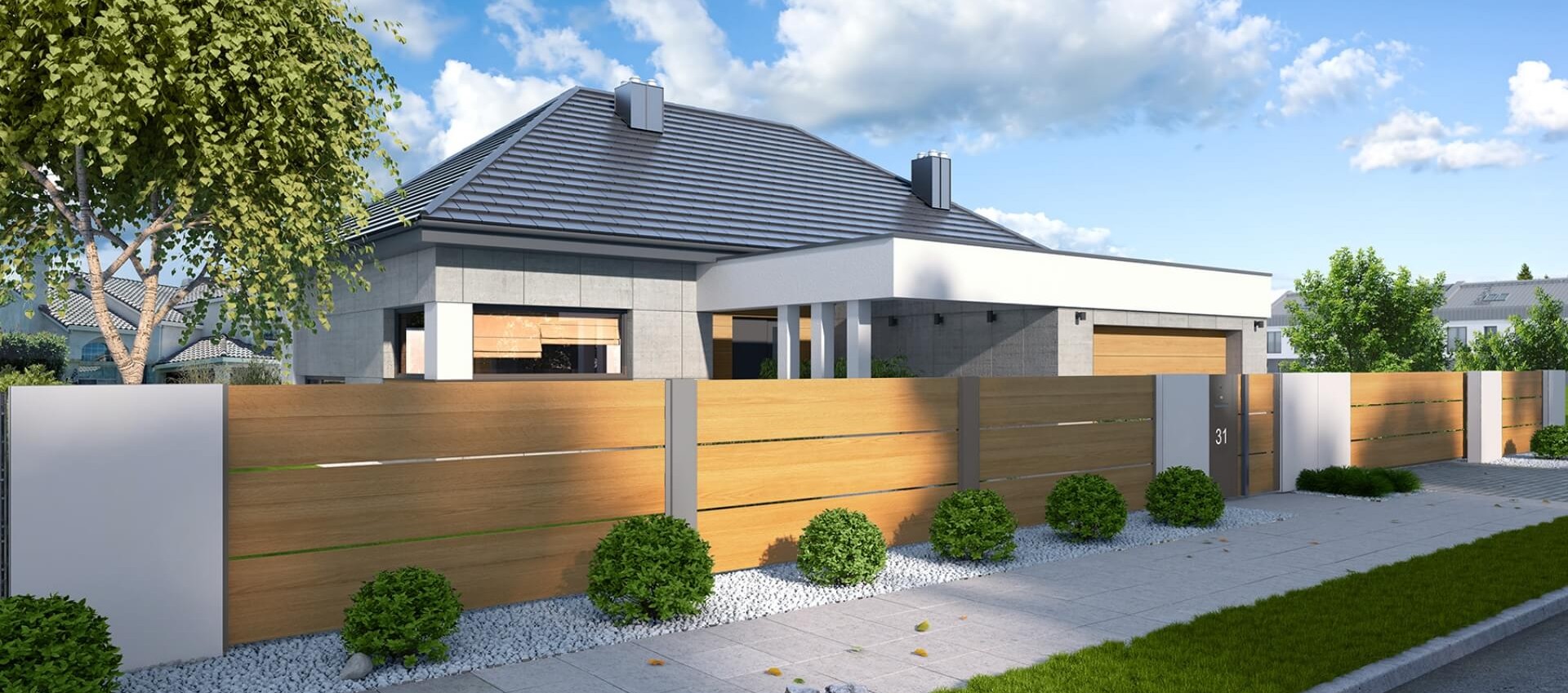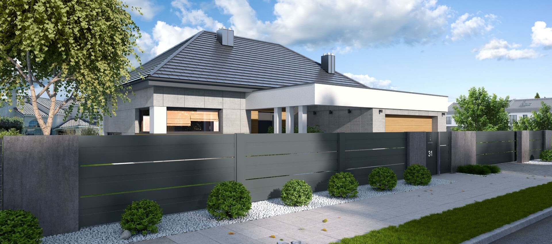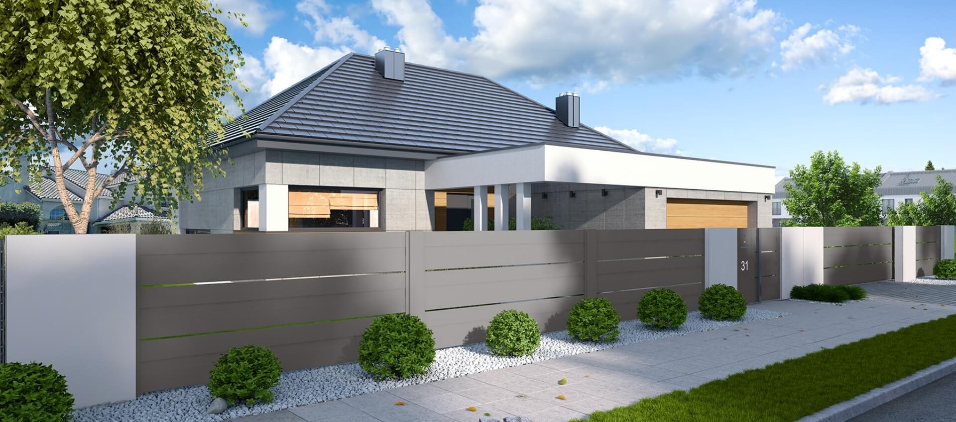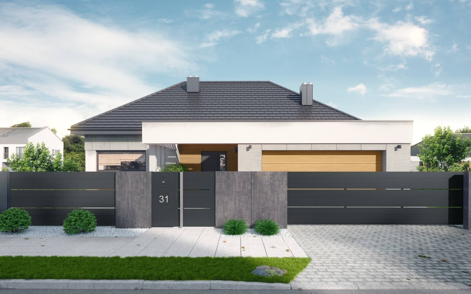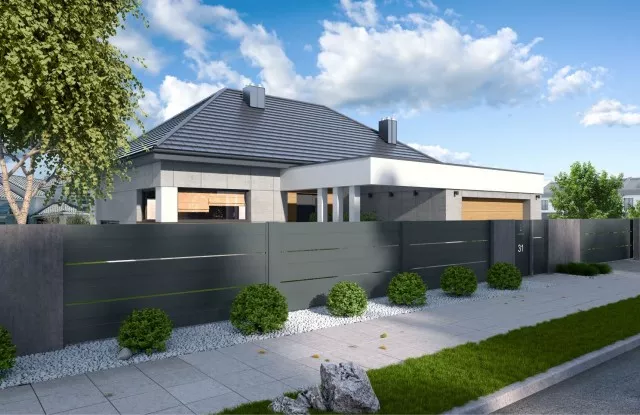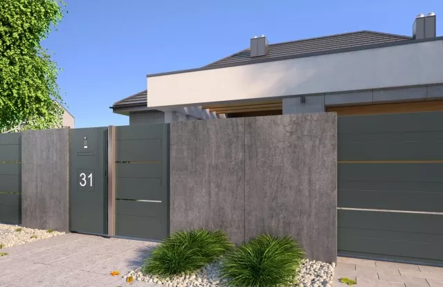 Der Zaun verfügt über ein modernes Schiebetor mit solider Automatisierung, das es Ihnen ermöglicht, das Grundstück zu betreten, ohne das Auto verlassen zu müssen. Statt eines traditionellen Türgriffs verfügt das Tor über einen minimalistischen Handlauf aus Edelstahl. Links vom Eingang befinden sich ein Durchwurfbriefkasten, ein Ziffernblock und eine beleuchtete Hausnummer, die es erleichtert, nach Einbruch der Dunkelheit die richtige Adresse zu finden.