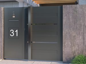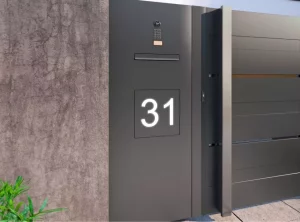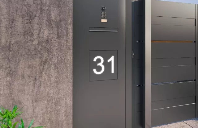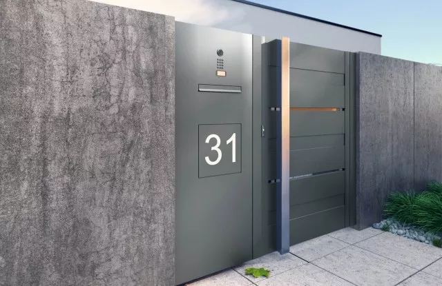 Ein Briefkasten ist ein wesentliches Element jedes Zauns. In diesem Projekt wurde er zusammen mit einer Videosprechanlage, einem Ziffernblock und einer beleuchteten Hausnummer in einem Paneel in der Nähe des Tores platziert.