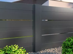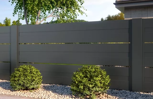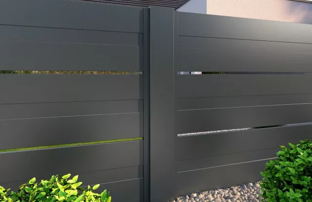 In diesem Projekt haben wir Aluminium-Zaunelemente von Arete Space verwendet, die mit einem langlebigen grauen Pulverlack überzogen sind. Die 500 mm breiten Profile sind durch schmale Zwischenräume voneinander getrennt, was die Struktur leicht macht, ohne die Privatsphäre im Garten zu beeinträchtigen.
