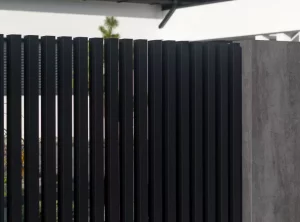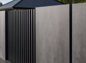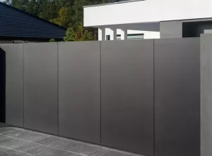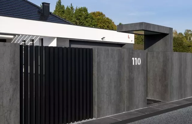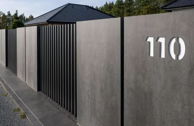 This time, we present a design characterized by a darker color palette. This minimalist fence is made from quartzite with a concrete texture and black-painted aluminum. The materials used are extremely durable, making the fence virtually maintenance-free.