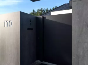 The centerpiece of the fence is the modern Arete Pure gate. It is clad in smooth black aluminum sheet and features a wide, painted handle. On the post next to the gate, you’ll find a mail slot, a video intercom system, and a backlit house number.
