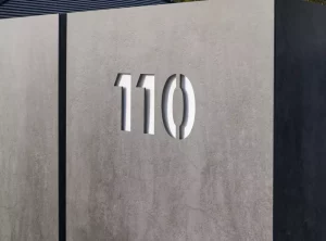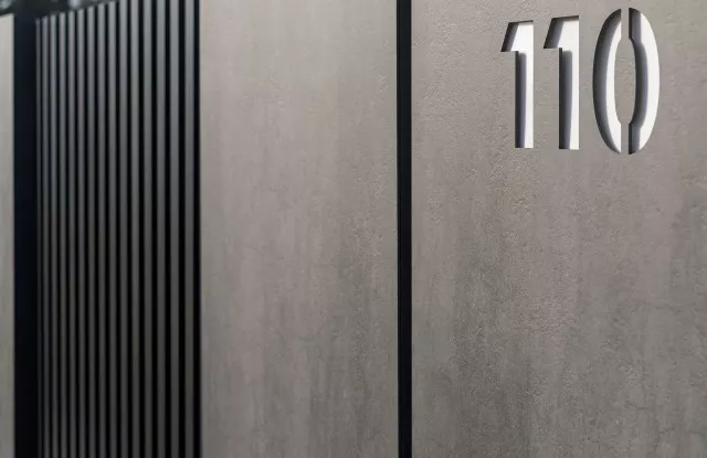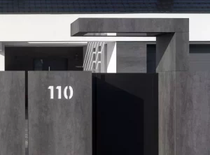 The house number is cut into the Rockina Cubero column next to the gate and illuminated with integrated LED lights that automatically switch on at night.