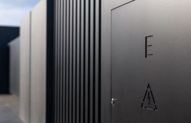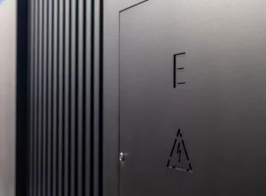 The electrical box is expertly integrated into the fence by enclosing it within a Rockina Cubero column, featuring black-painted doors with appropriate labeling.
