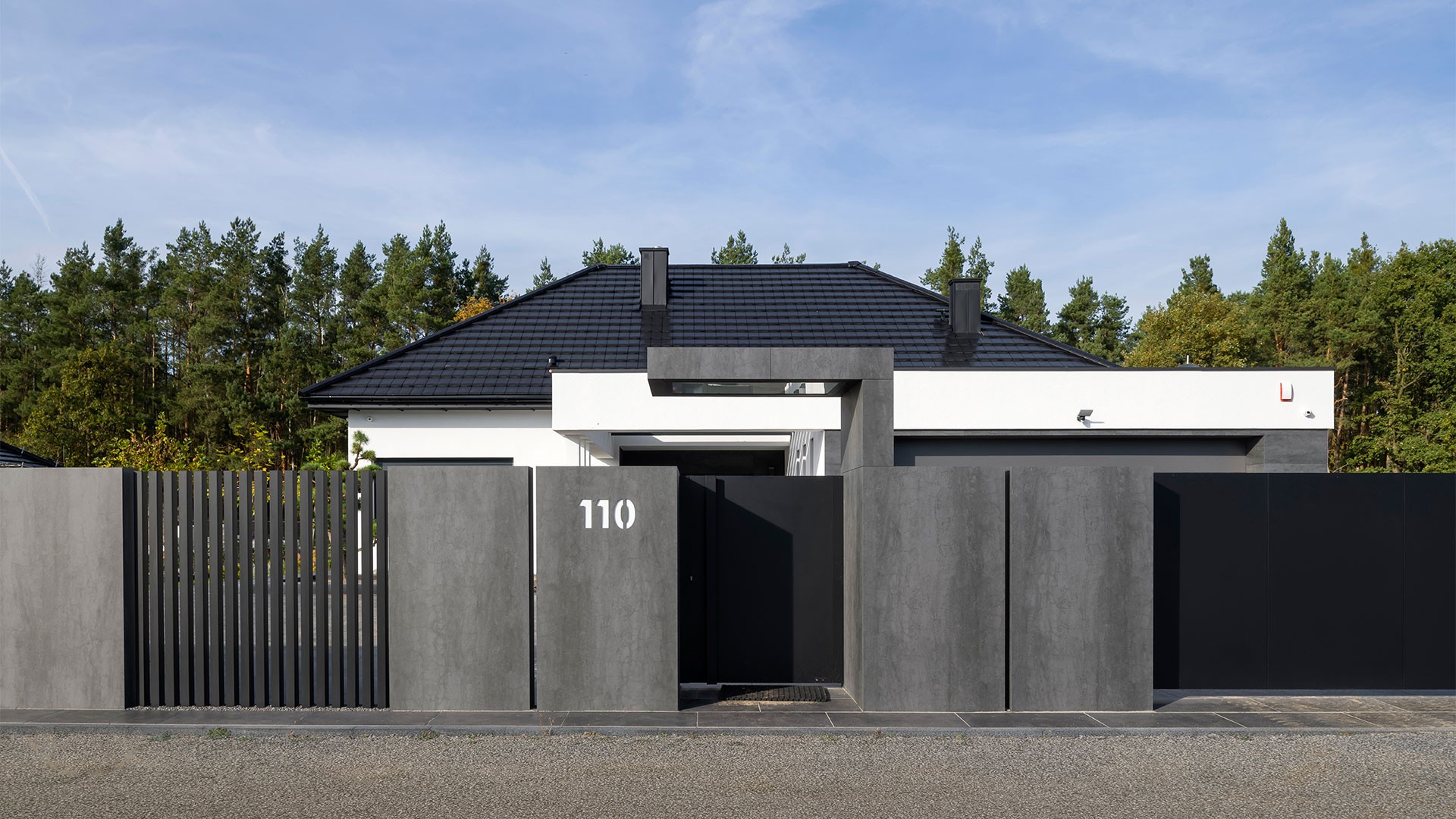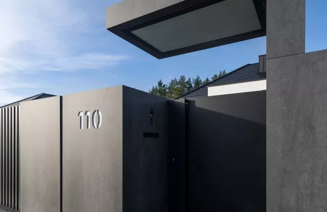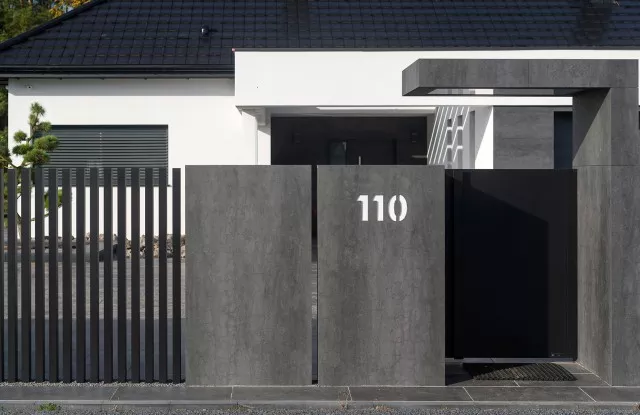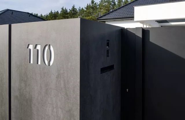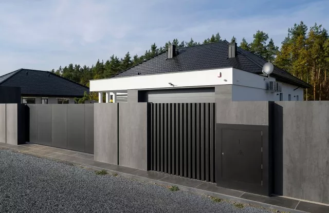 The fence is made of posts from the Rockina Cubero system, finished with dark grey quartz sinter featuring a concrete texture. To avoid the appearance of a heavy wall, the posts were grouped in pairs with narrow gaps between them. One of the pillars conceals a control box, accessible via a painted door with appropriate labeling. Between the post pairs are vertical Arete Vertico aluminum profiles in black. These were installed directly into the ground without a foundation, creating a light and subtle definition of the property boundaries.