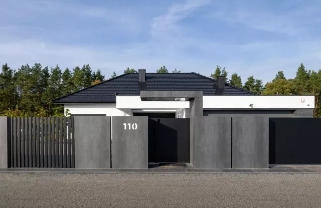The modern sliding gate is equipped with a robust automation system and, like the main gate, is clad in smooth black aluminum sheet. A signal light is mounted on the post next to the entrance to enhance safety when entering or exiting the property. The base of the fence consists of light grey Horizon Massive aluminum profiles. In this design, wide panels were installed without gaps to ensure maximum privacy for the residents.