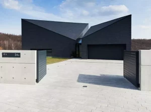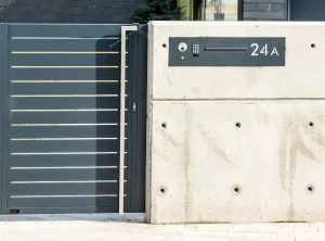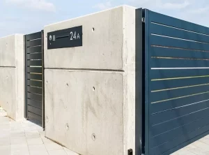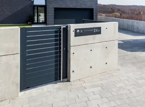 The walls of clean, poured architectural concrete are an important element of the architectural design and have been provided by the investor. Their form was consulted with our designer to ensure compatibility with the Xcel gate and wicket. The raw imperfection of the concrete fits perfectly into the aesthetics of the entire project.