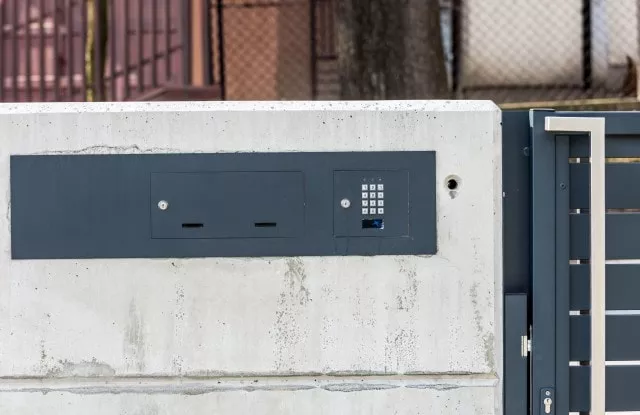 Der moderne Briefkasten ist eine ästhetische und funktionale Ergänzung zum Zaun. Das durchgehende Design ermöglicht die bequeme Entnahme von Briefen direkt vom Grundstück. Die Platte des Kastens besteht aus pulverbeschichtetem Edelstahl in einer Farbe, die mit den anderen Elementen des Projekts harmoniert. Die Hausnummer wurde ebenfalls ausgeschnitten, ebenso wie eine Videosprechanlage und ein Ziffernblock.