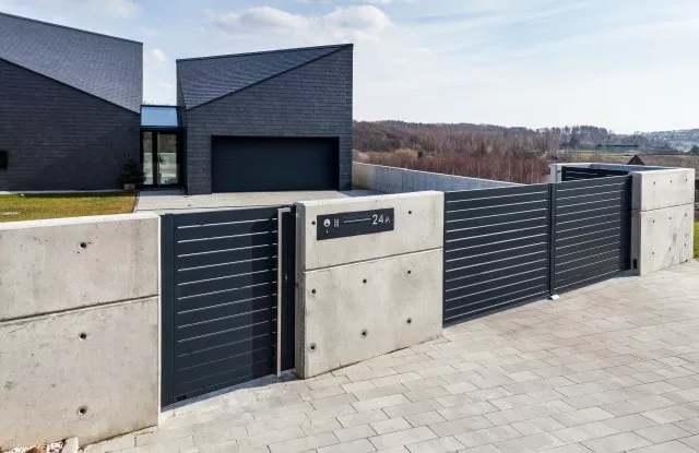 Der Entwurfsprozess wurde in Zusammenarbeit mit dem Studio RS+ durchgeführt. Der Kunde wollte eine Barriere errichten, die das Grundstück von den unscheinbaren Gebäuden auf der Straßenseite trennt. Die Arbeiten wurden durch erhebliche Unebenheiten des Geländes erschwert. Im Projekt wurden Betonwände und Arete Horizon-Aluminium-Zaunplatten verwendet. Die Betonelemente wurden vom Investor bereitgestellt, ihre Auswahl wurde jedoch mit unseren Spezialisten abgesprochen, um die Kompatibilität mit dem Xcel-Pforte und -Tor sicherzustellen.