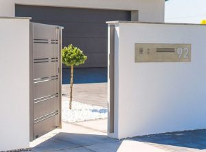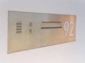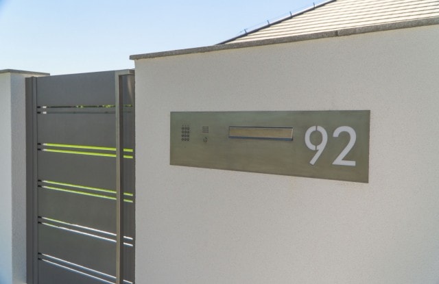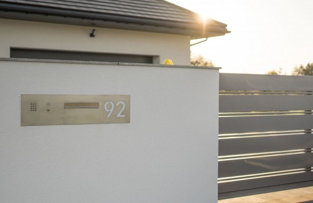 Der Kunde entschied sich für einen modernen Briefkasten. Seine Blende enthält einen Ziffernblock, eine Videosprechanlage und eine lasergeschnittene Hausnummer.