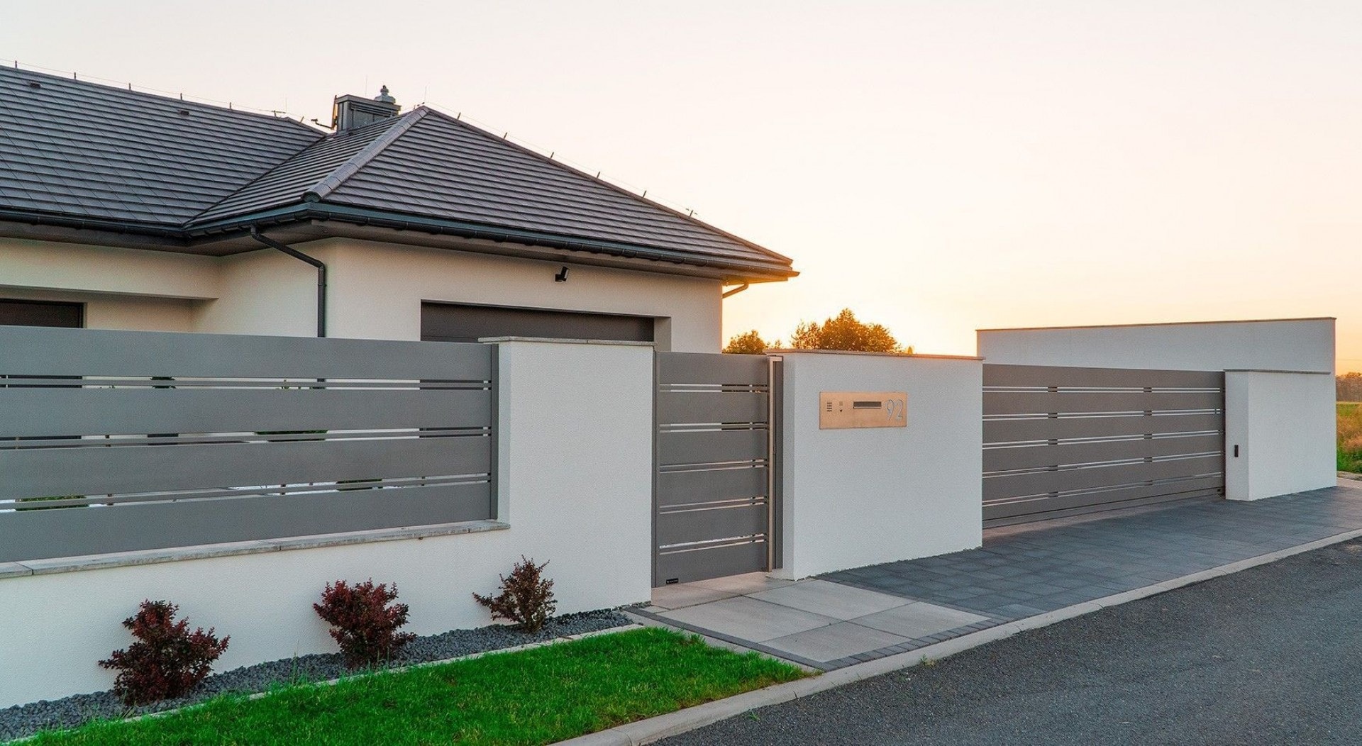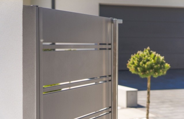 Die Umzäunung wurde aus breiten, aluminiumfarbenen Horizon Massive Zaunelementen gefertigt. Im Seitenteil bilden sie eine kompakte Struktur, die den Garten von der belebten Straße trennt, und von vorne einen leichten, repräsentativen Zaun.