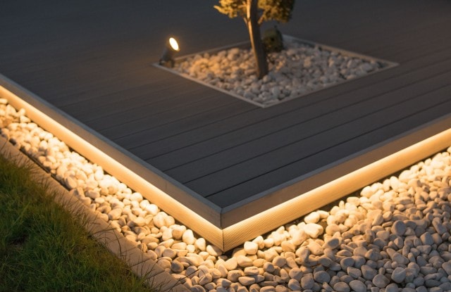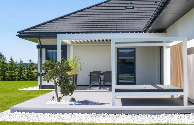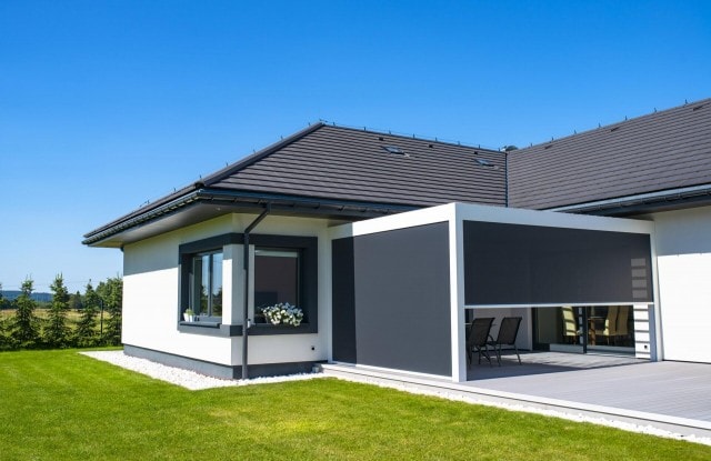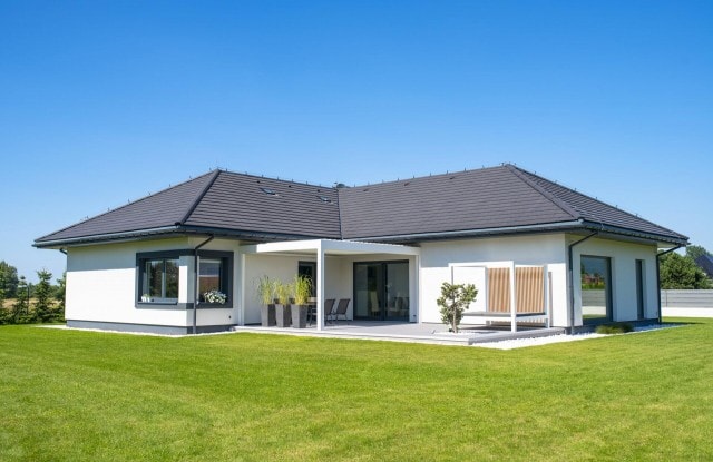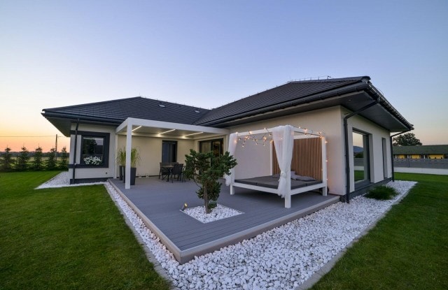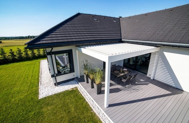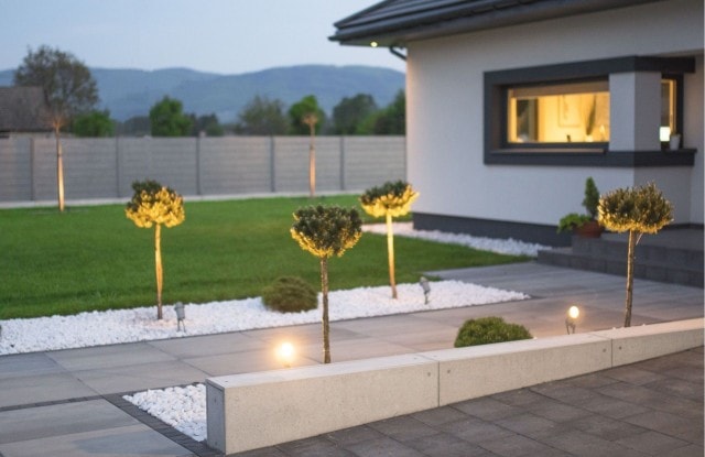Eine einzigartige Lösung ist die seitliche Beleuchtung der Zaunelemente im vorderen Teil des Zauns. Längs angeordnete Lichtquellen schalten sich nach Einbruch der Dunkelheit automatisch ein. Das Tor wurde mit einem minimalistischen Edelstahlhandlauf ausgestattet und in seiner Nähe wurde ein moderner Postkasten mit lasergeschnittener Hausnummer, Ziffernblock und Videosprechanlage angebracht. Der Zaun bietet Platz für Abfalleimer und einen Hauswirtschaftsraum, der mit einer Aluminiumkonstruktion überdacht wurde. An der Rückseite des Hauses wurde außerdem eine funktionale Terrasse angelegt.