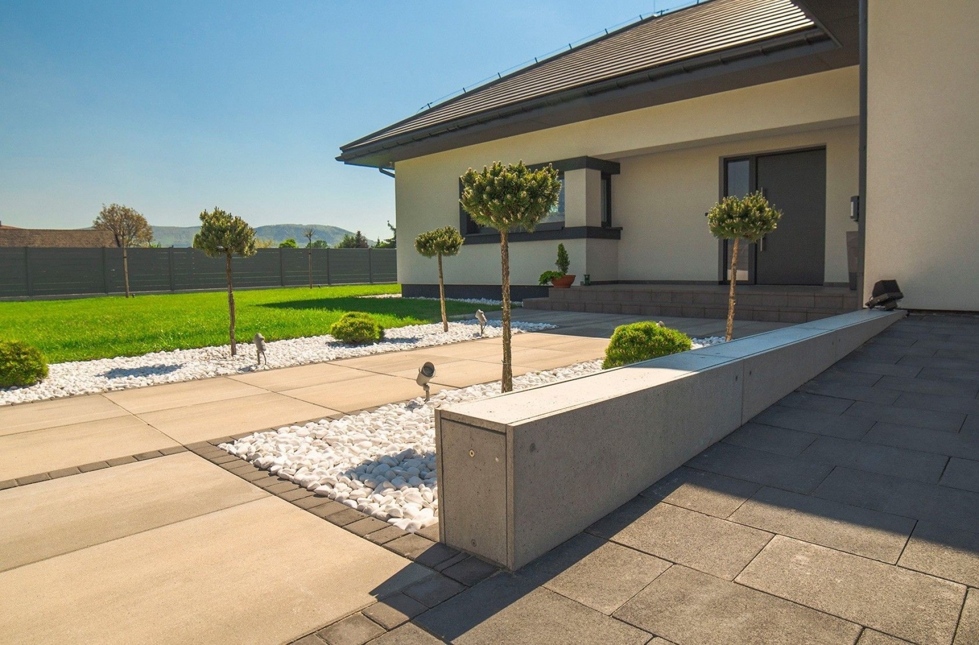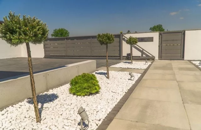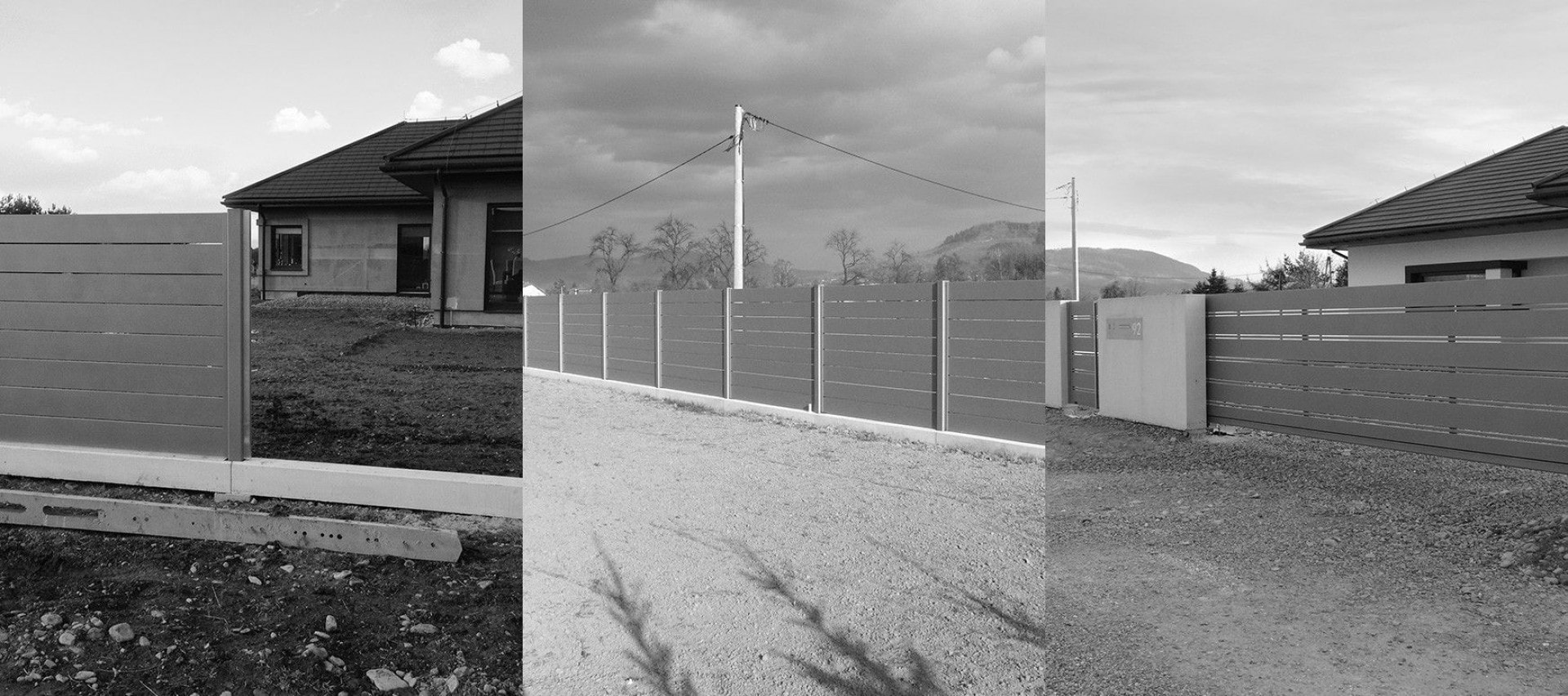 Der vordere Teil des Zauns besteht aus Arete Horizon Aluminiumspannen in zwei Breiten und einfachen verputzten Wänden. Aufgrund der Form des Grundstücks überlappt das Schiebetor nach dem Öffnen das Tor, sodass wir einen zusätzlichen elektronischen Schutz eingesetzt haben. Fundamente und verputzte Säulen wurden mit Dächern aus Architekturbeton abgedeckt. Die Dächer wurden auch in einer Stützmauer auf dem Grundstück verwendet. Im vorderen, repräsentativen Teil des Zauns haben wir uns für Vollfundamente entschieden.