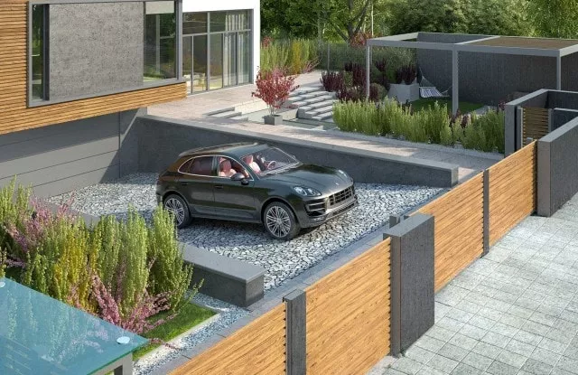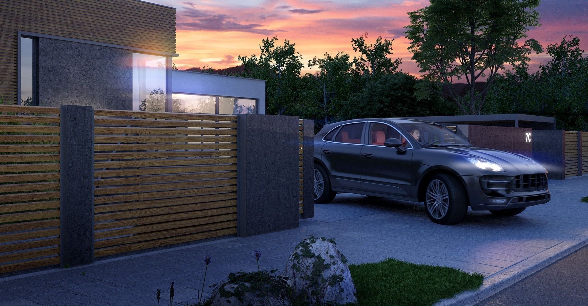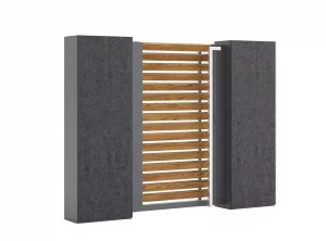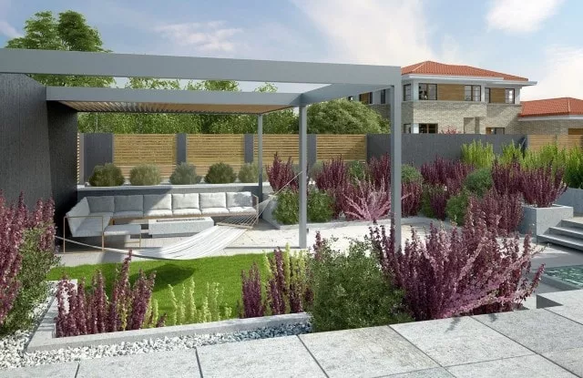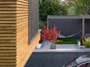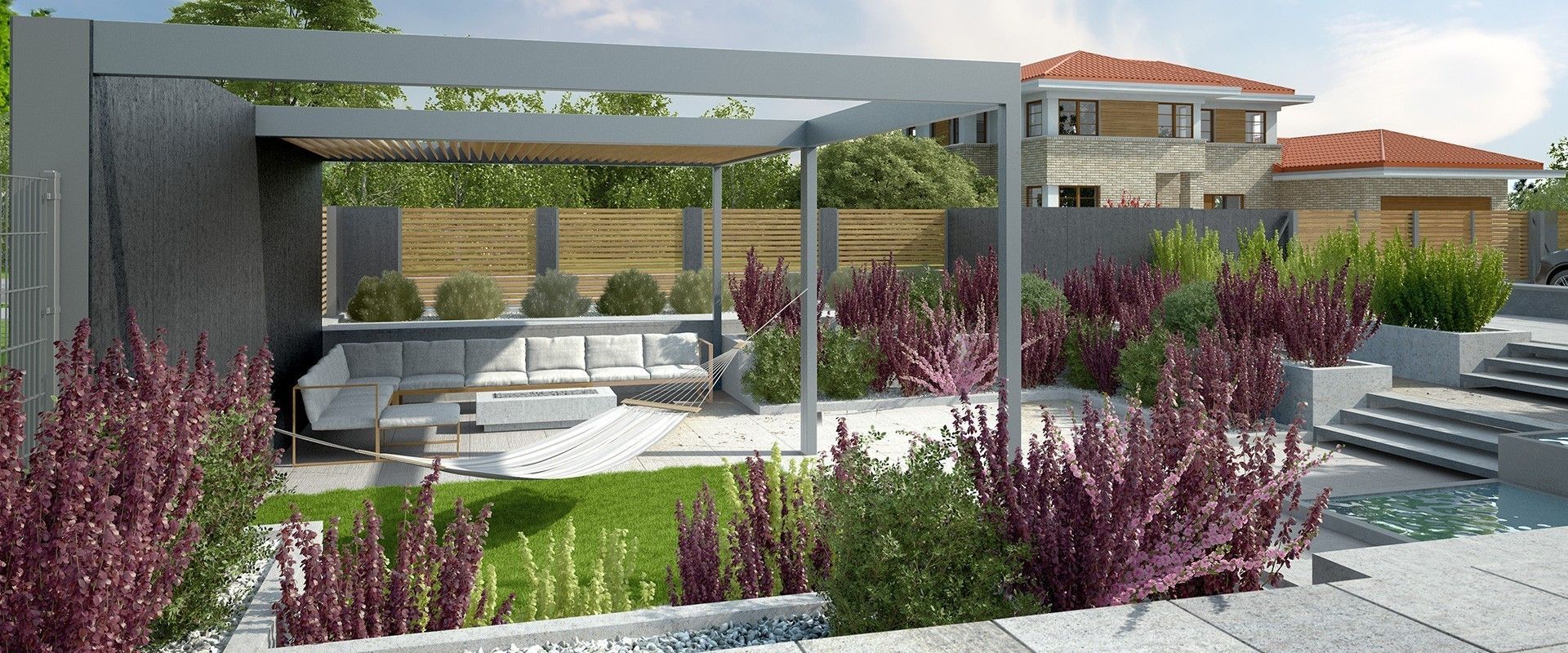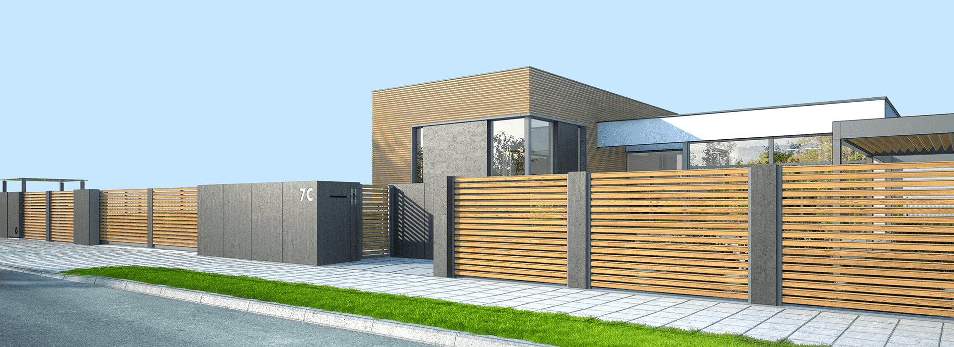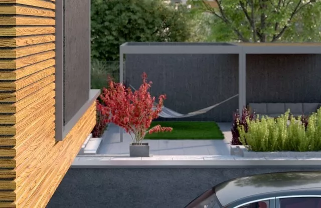 Xcel umfasst nicht nur Zäune, sondern auch Aluminium-Fassadenbretter und Elemente kleiner Architektur für Ihren Garten. Die folgende Visualisierung zeigt, wie mit den Systemen Horizon Rombo, Rockina Cubero und Structure ein funktionaler und optisch stimmiger Raum geschaffen werden kann. In diesem Garten haben wir eine Entspannungszone für die Bewohner und praktische Hauswirtschaftsräume entworfen.