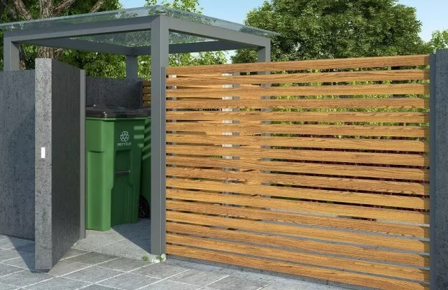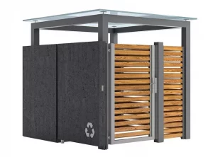 Der Hauswirtschaftsraum verdeckt auf ästhetische Weise die Mülltonnen. Die Konstruktion besteht aus den gleichen Materialien wie der Rest des Zauns und wurde mit einem Glasdach abgedeckt.