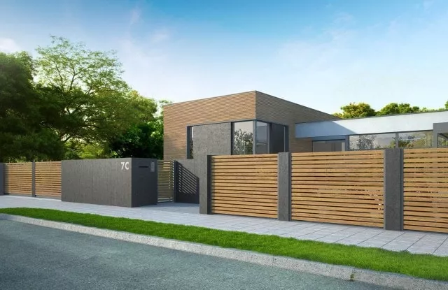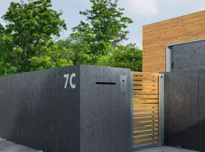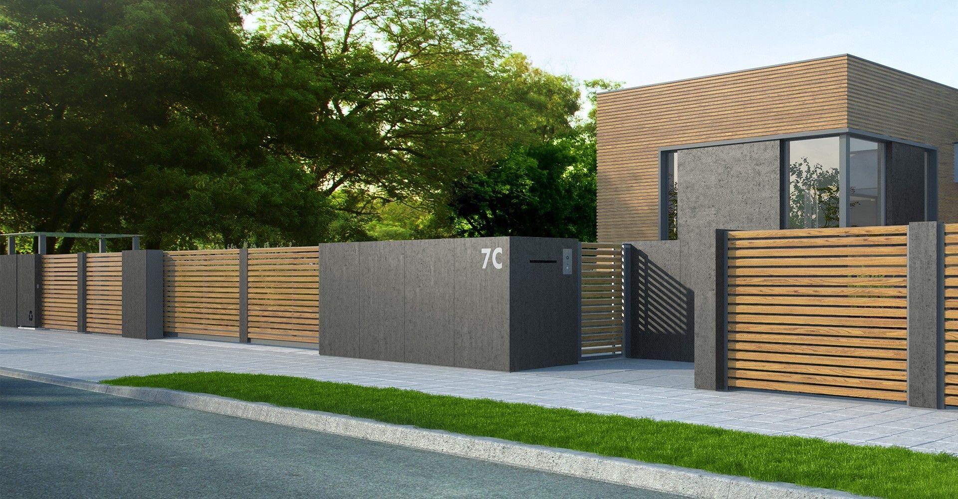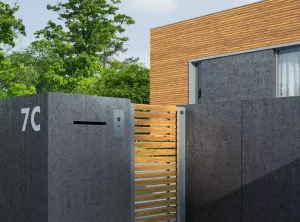 Eine attraktive Ergänzung zum minimalistischen Zaun ist ein eingebauter Briefkasten, der es Ihnen ermöglicht, bequem Briefe aus dem Garten zu entnehmen. Der Briefkasten ist ein länglicher Schlitz in der Nähe des Tores.