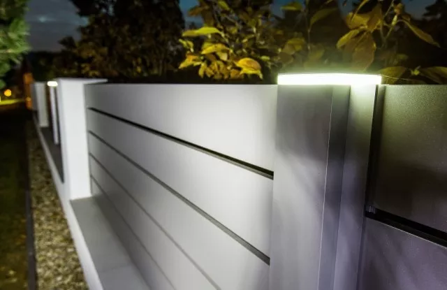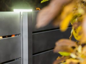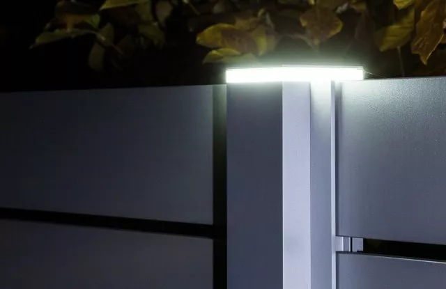 Zusätzliche LED-Beleuchtung oben an den Pfosten betont dezent die Qualität des Zauns.