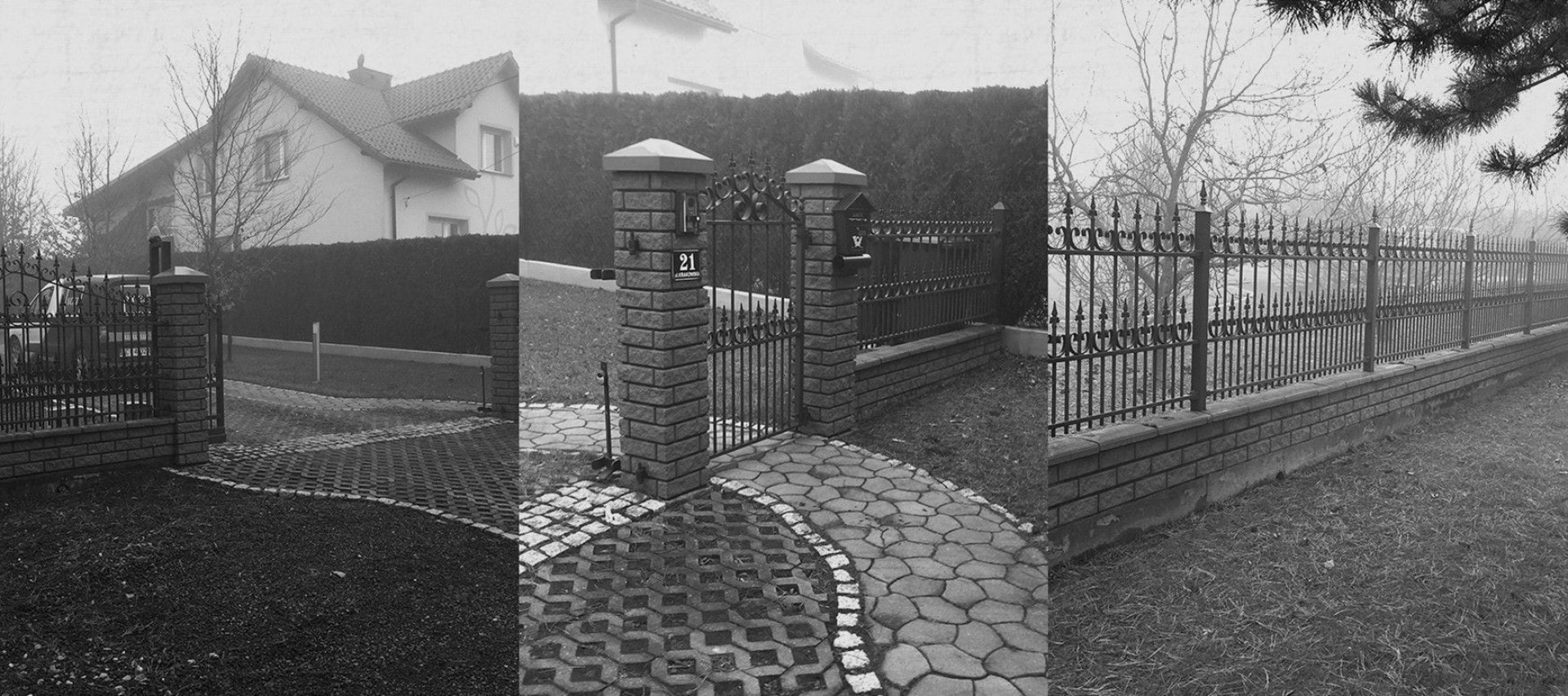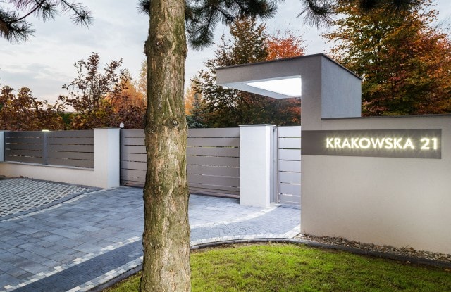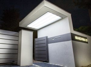 Der Blickfang ist die Eingangsabdeckung in Form eines einfachen Visiers mit eingebauter LED-Beleuchtung. In der Nähe des Tors befand sich ein modernes Postfachmodul mit einem Briefkasten, einer Video-Gegensprechanlage und einem Ziffernblock. Seine Erweiterung ist eine Tafel mit einer lasergeschnittenen Adresse, die zusammen mit der LED-Beleuchtung an Aluminiumpfosten nach Einbruch der Dunkelheit automatisch aufleuchtet.