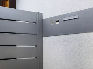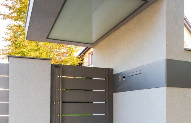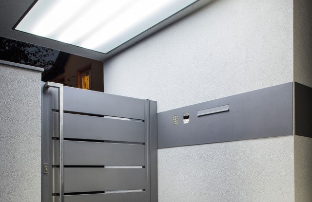 In diesem Projekt wurde eine Eckversion verwendet, die aus zwei Modulen besteht. Das erste davon ist eine Platte mit einem Schlitz zum Einwerfen von Briefen sowie einer integrierten Videosprechanlage und Tastaturen. Im zweiten Modul wurde die Adresse lasergeschnitten und nach Einbruch der Dunkelheit automatisch beleuchtet.