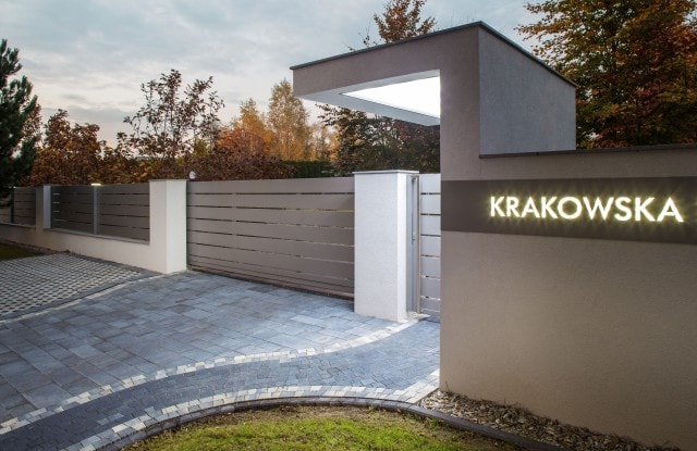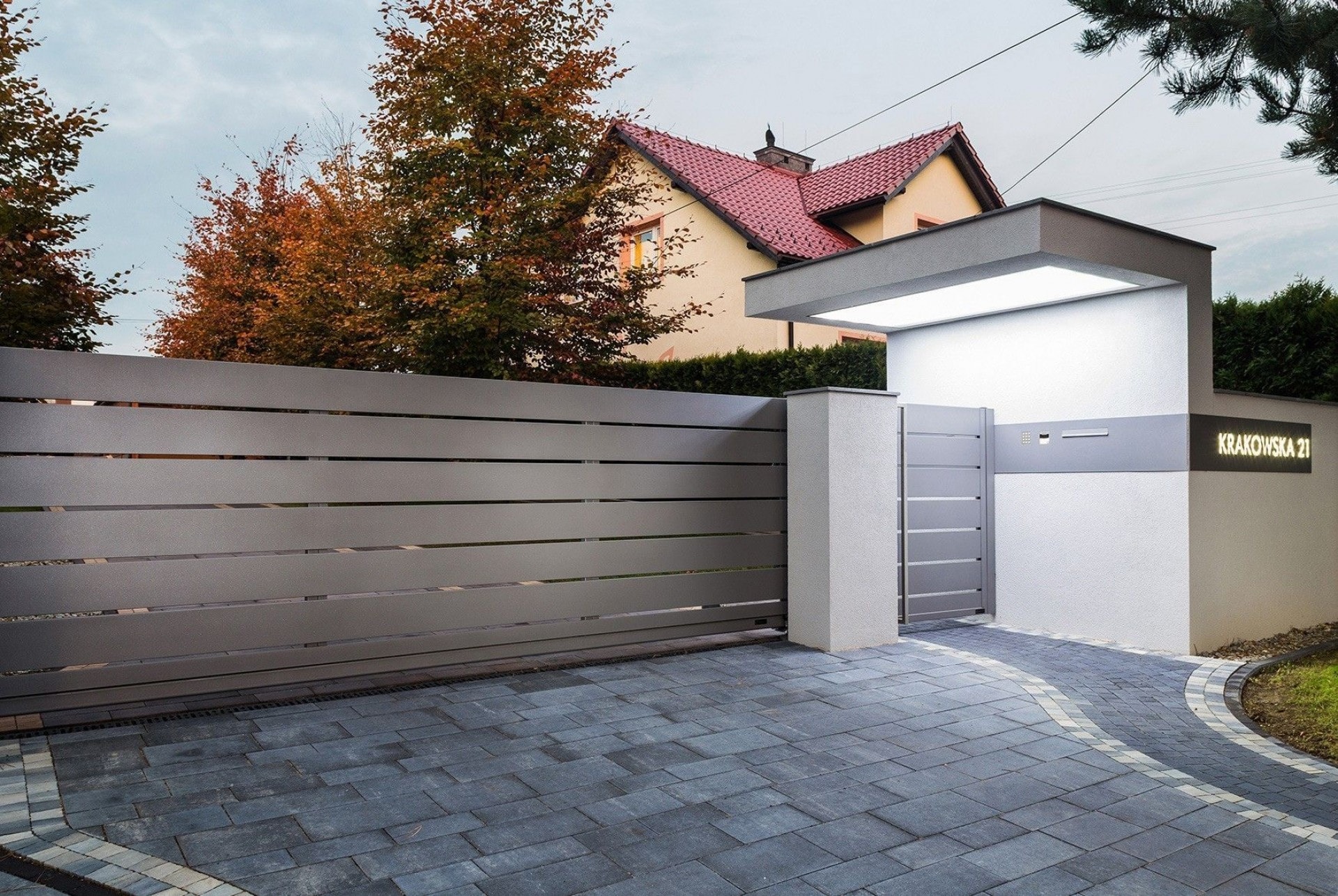 Das Schiebetor ist eine moderne Lösung, die sich auch für breite und flache Grundstücke perfekt eignet. Bei diesem Projekt wurde der solide Rahmen mit grauen Horizon Massive-Profilen in einer Farbe gefüllt, die mit den anderen Elementen des Zauns harmoniert.