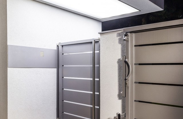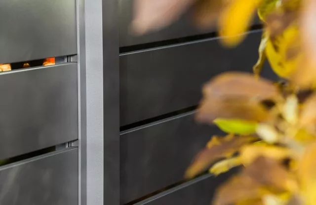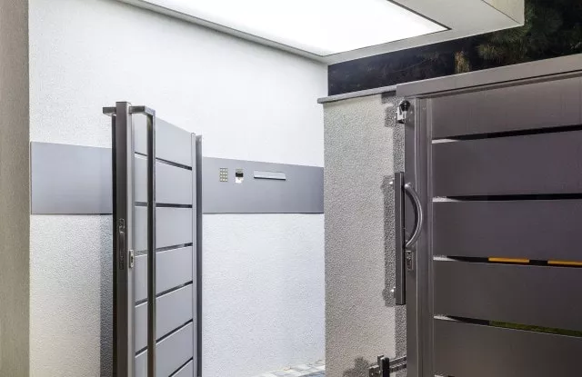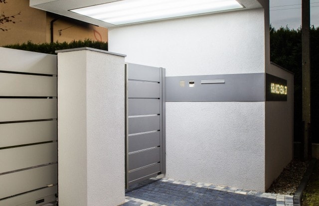 Der Zaun ist funktional und ästhetisch zugleich. Weite Horizonte Massive Aluminiumprofile sorgen für Privatsphäre im Garten. Alle Zusatzelemente bilden ein stimmiges und harmonisches Ganzes. Eine spezielle Beleuchtung erleichtert die nächtliche Adressfindung und erhöht die Sicherheit rund um das Grundstück.