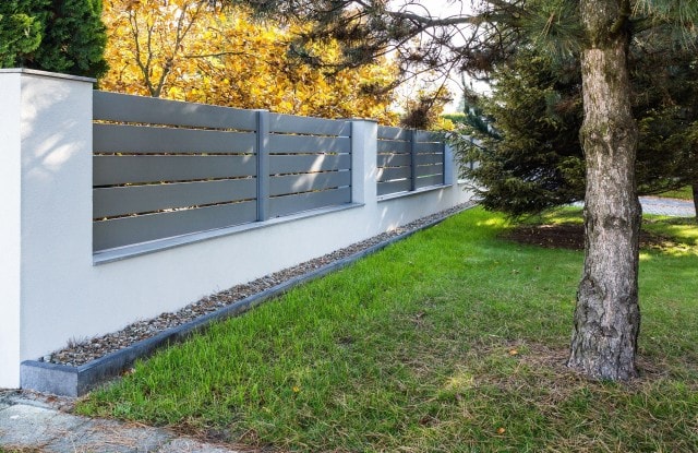 Der bestehende Zaun entsprach nicht den Erwartungen des Kunden. Stahlmodule gewährleisteten keine Privatsphäre im Garten und zusätzliche Elemente wie der Briefkasten oder das Hausnummernschild passten nicht zu den übrigen Elementen. Als Basis für den neuen Zaun wurden einfache verputzte Fundamente und Pfeiler gewählt, zwischen denen wir Horizon Massive Aluminiumprofile in Grau platzierten.