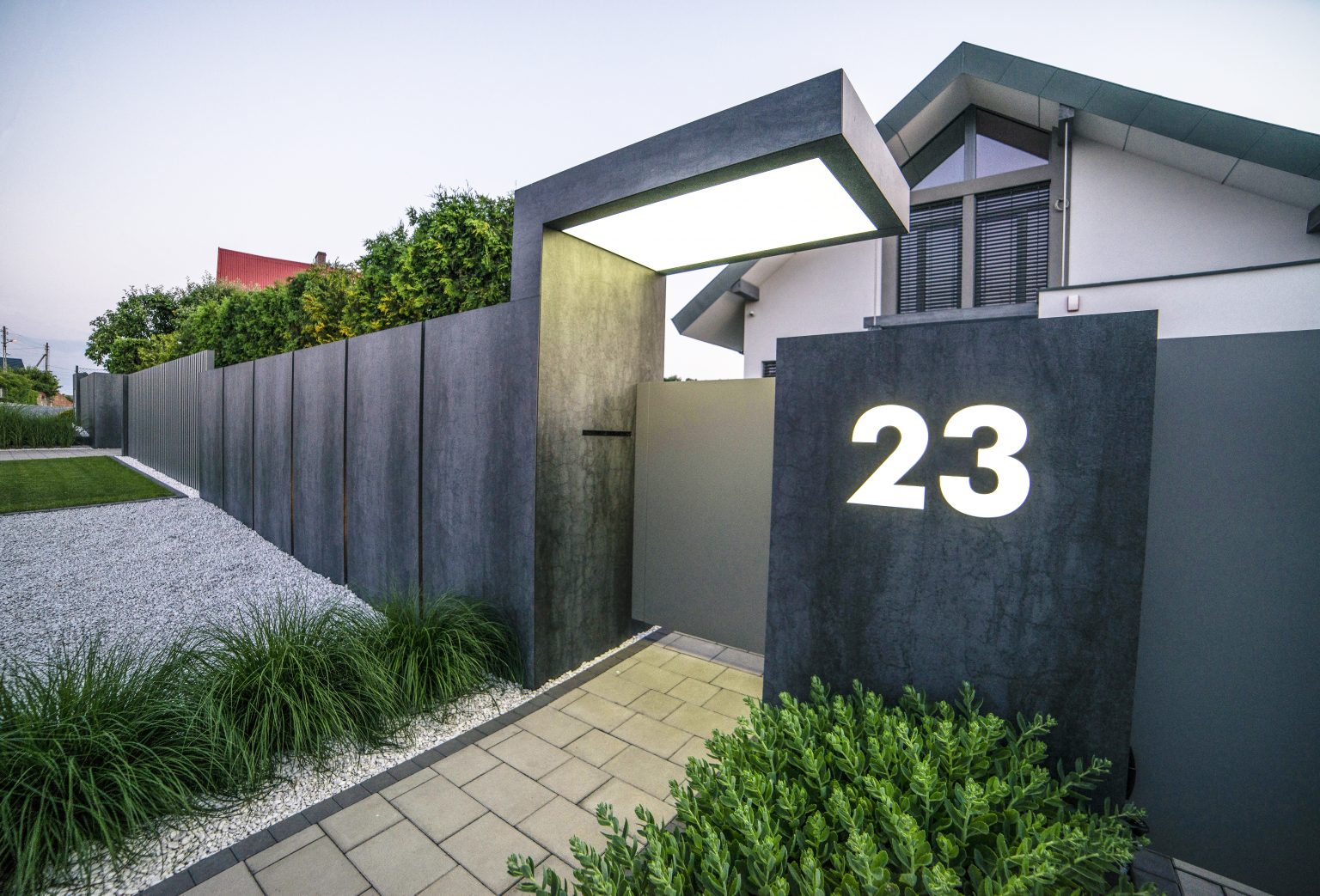 The modern sliding gate is made of smooth metal sheet, color-matched to the rest of the fence. Fast and suitable for high loads, the automation is compatible with the smart home system.